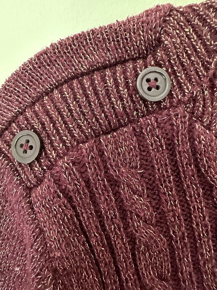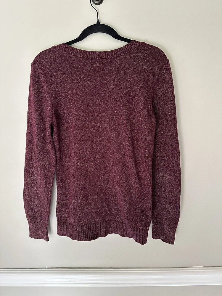 This beautiful Banana Republic sweater is perfect for any occasion. With a crew neckline and long balloon sleeves, it features a stunning multicolor metallic cable-knit design that adds a touch of sparkle and glimmer. Made from a blend of polyester, angora rabbit hair, cotton, and metallic fibers, this sweater is stretchy and comfortable to wear in any season. Whether you're dressing up for a party, dressing down for work, or simply looking for a cozy everyday sweater, this piece is a must-have addition to your wardrobe. It's available in size L and is hand wash only. Shop now and add some sparkle to your closet!