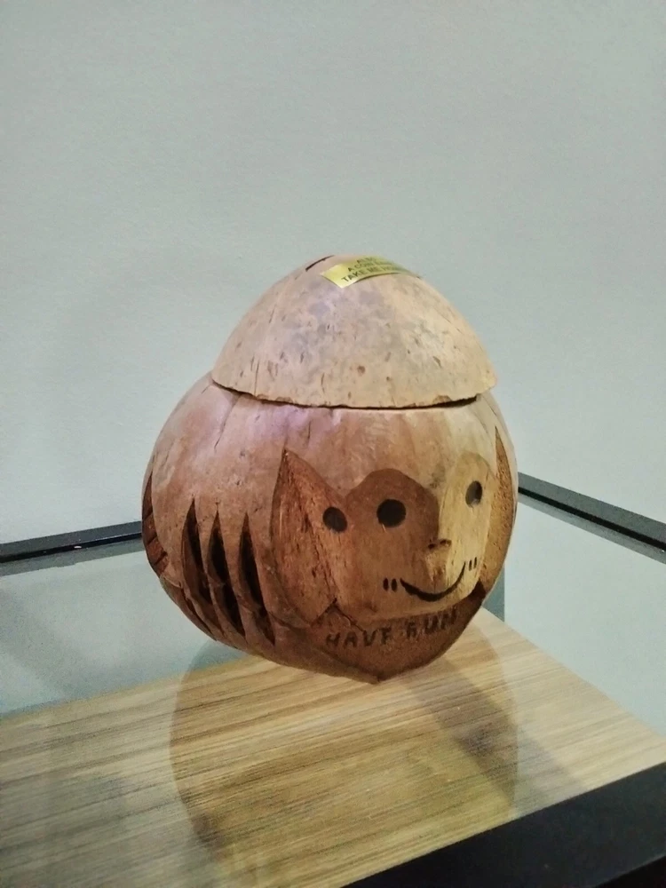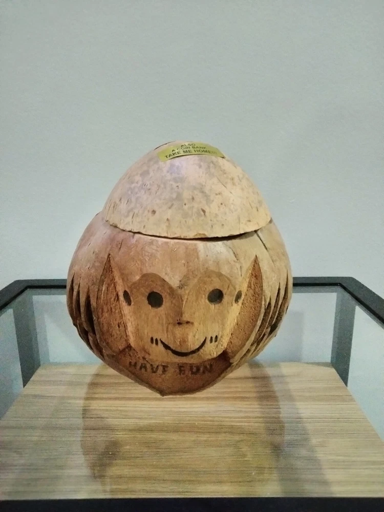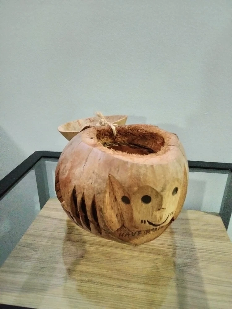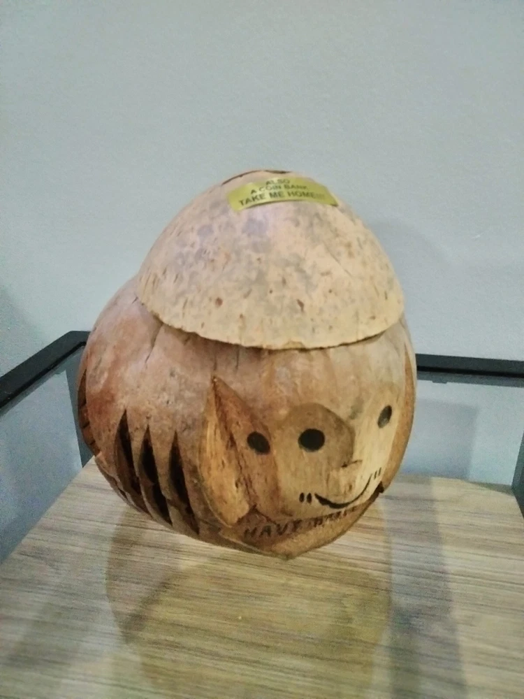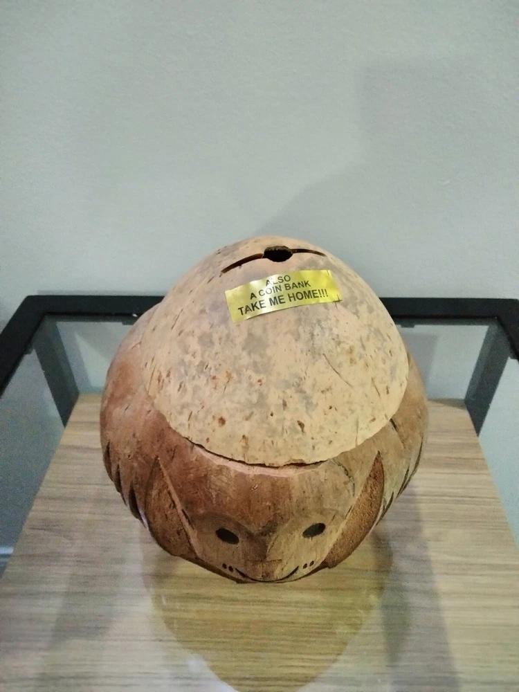 Made from a real coco! Hand carved and designed by hand. Can be used as decoration and functions also as a coin bank!