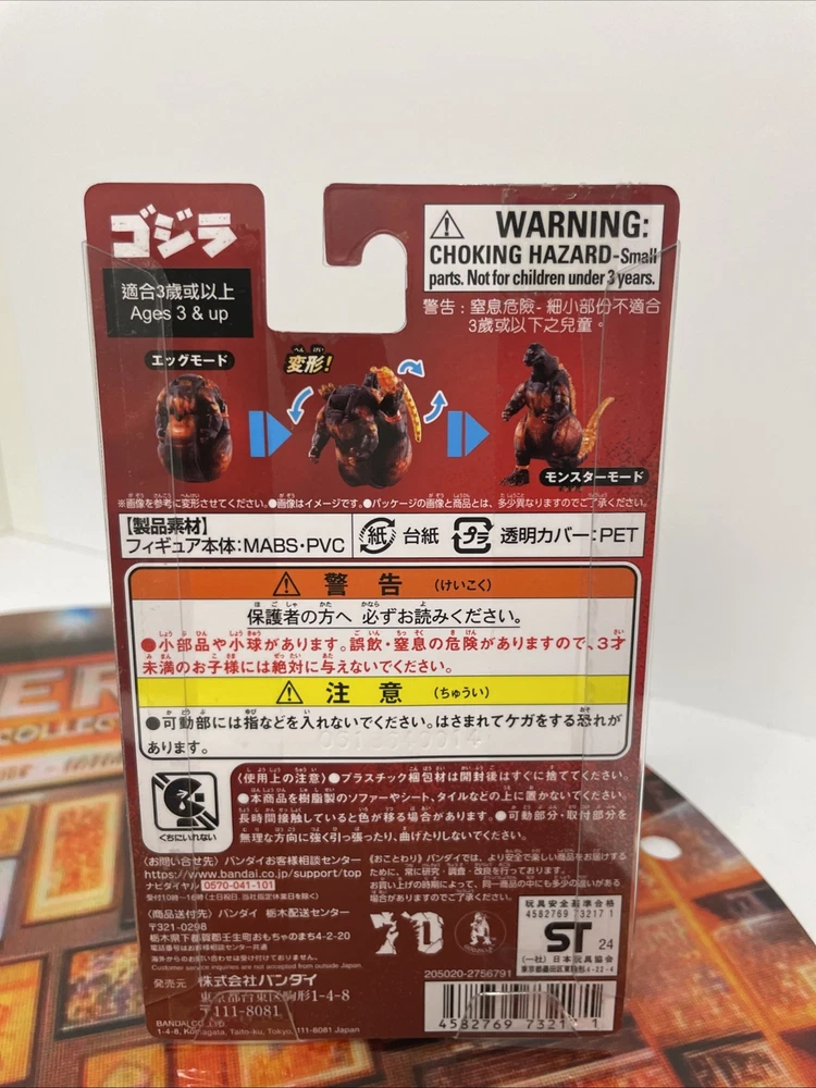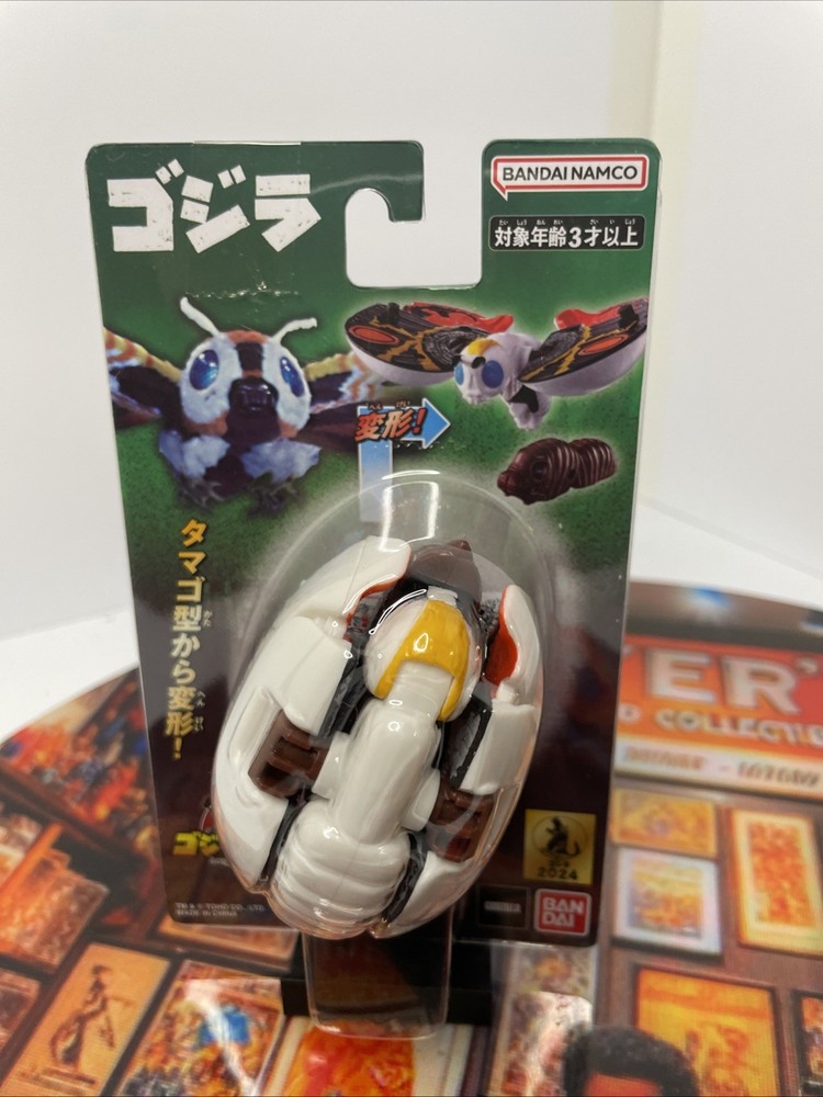 Bandai Godzilla Transforming Egg figures from the 2024 series. These figures, when in their egg form, are designed to transform into the characters Burning Godzilla and Mothra. Each figure is packaged individually, displaying both the egg form and the transformed character on the packaging. The packaging also includes the Bandai Namco logo, the Godzilla logo, and the age recommendation of 3 years and up. Burning Godzilla: The egg is primarily black and orange, representing Burning Godzilla's fiery appearance. The packaging shows the egg transforming into Burning Godzilla, with his characteristic red and orange highlights. Mothra: The egg is white with brown and yellow accents, representing Mothra's colors. The packaging illustrates the egg transforming into both Mothra's adult and larval forms. These figures are part of the "Egg Monsters Godzilla" line, where the gimmick is the ability to transform between an egg shape and a monster form. When transformed, the figures stand approximately 4.5 inches tall. This is a Bandai Godzilla Transforming Egg figure set that includes Fire Godzilla and Mothra. The figures are made in Japan and are recommended for children aged 6 and above. The set features a unique design and is part of the Godzilla theme. The figures can be transformed into different shapes and are perfect for collectors and fans of the franchise.