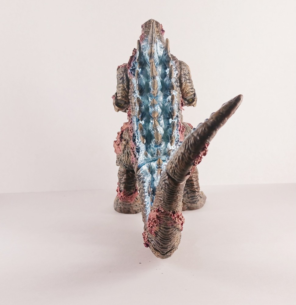 Bandai namco godzilla minus one action figure, repainted to give godzilla his look from the final scene of godzilla minus one, also has custom added on scars from when he forced down to the ocean floor and rise up again. the scars are made from sculpting hot glue on to the figure. the figure comes with an heat ray accessorie.