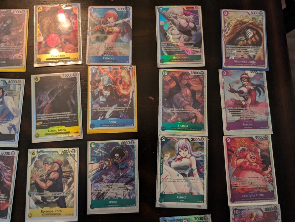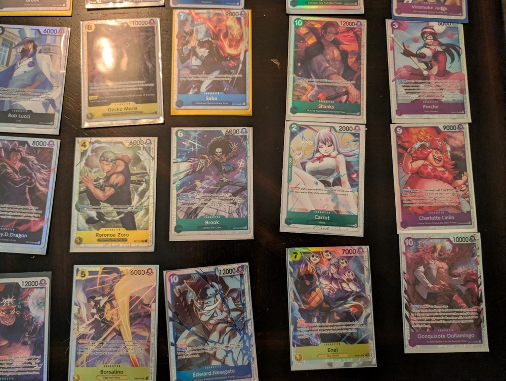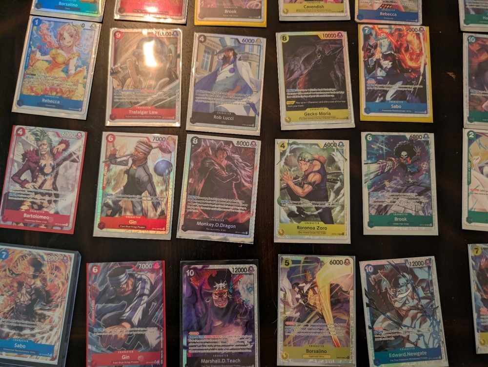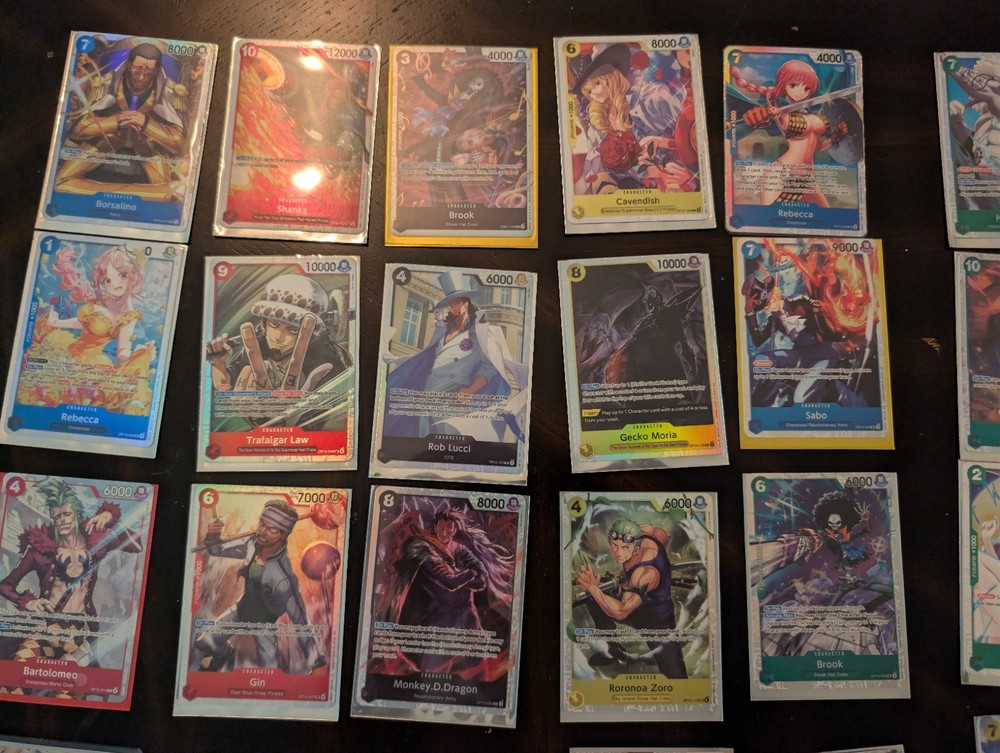 Character: Borsalino, Rebecca, Trafalgar Law, Rob Lucci, Cavendish Card Type: Character Card Condition: Lightly Played (Excellent) Finish: Foil, Regular Number of Cards: 25 Manufacturer: Bandai Attribute/MTG:Color: Red, Blue, Yellow, Green, Purple Language: English Card Size: Standard Material: Card Stock Game: One Piece Card Game Card Name: Borsalino, Rebecca, Trafalgar Law, Rob Lucci, Cavendish