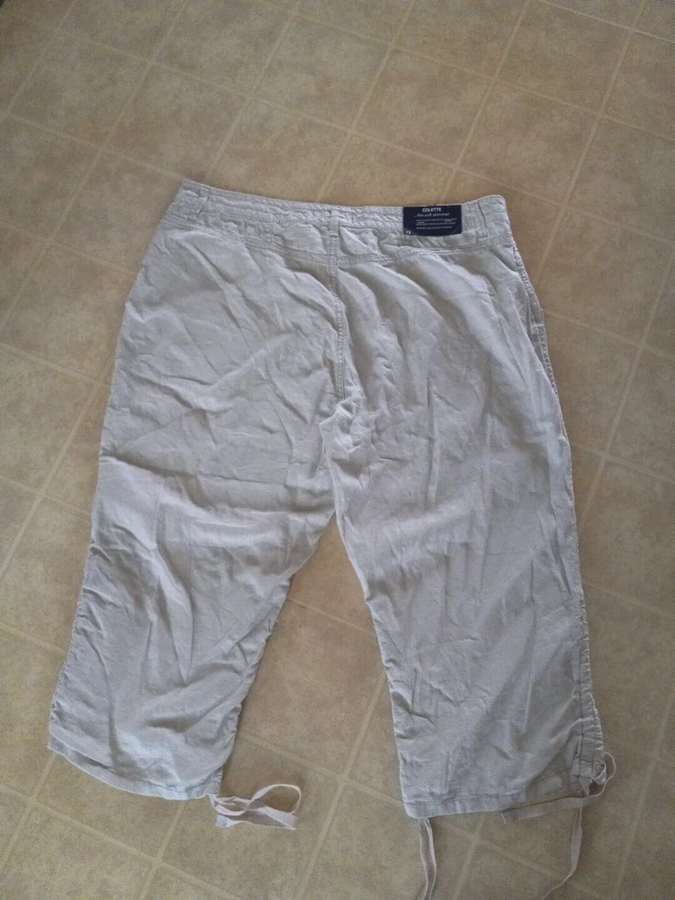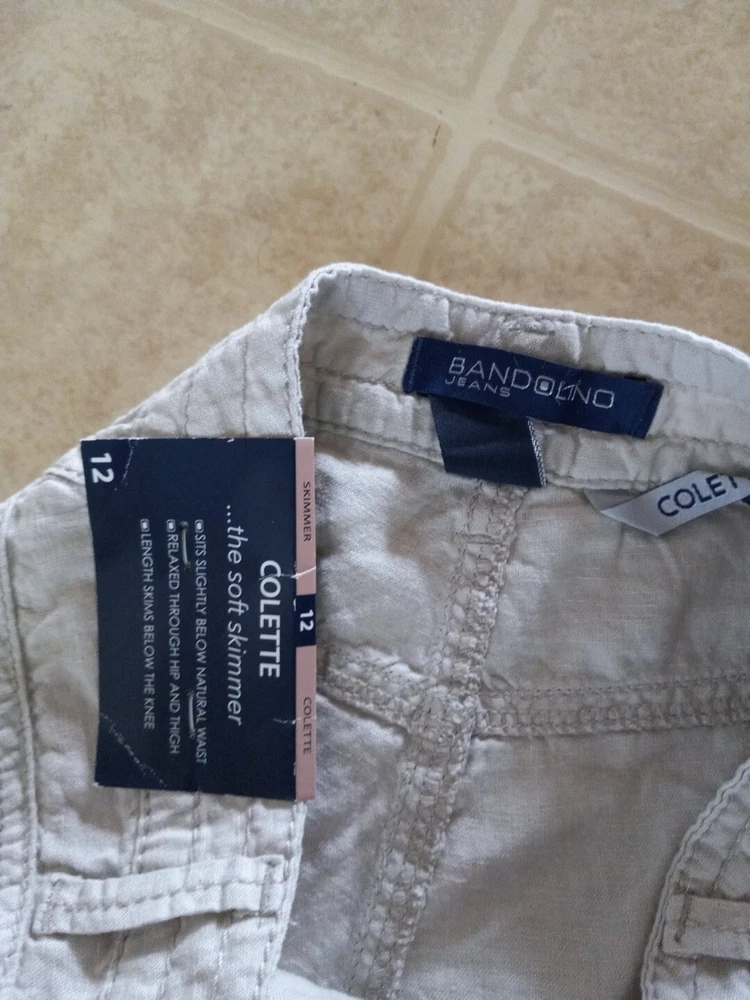 Fabric Type: Knit Closure: Button, Zip Garment Care: Machine Washable Brand: Bandolino Inseam: 20 in Handmade: No Occasion: Casual Size: 12 Leg Style: Straight Features: Crop Waist Size: 32 in Personalize: No Style: Cropped Front Type: Flat Front Pattern: Solid Vintage: No Department: Women Size Type: Regular Color: Beige Theme: 80s, 90s, Art, Beach, Bohemian, Fun, Hippie, Hipster, Love, Peace, Preppy, Retro, USA, American, Classic, Colorful, Designer, Elegant, Happy, Modern, Outdoor, Princess Fit: Regular Material: Linen, Viscose Season: Fall, Spring, Summer, Winter Country/Region of Manufacture: Unknown Type: Pants Accents: Button, Logo, Zipper