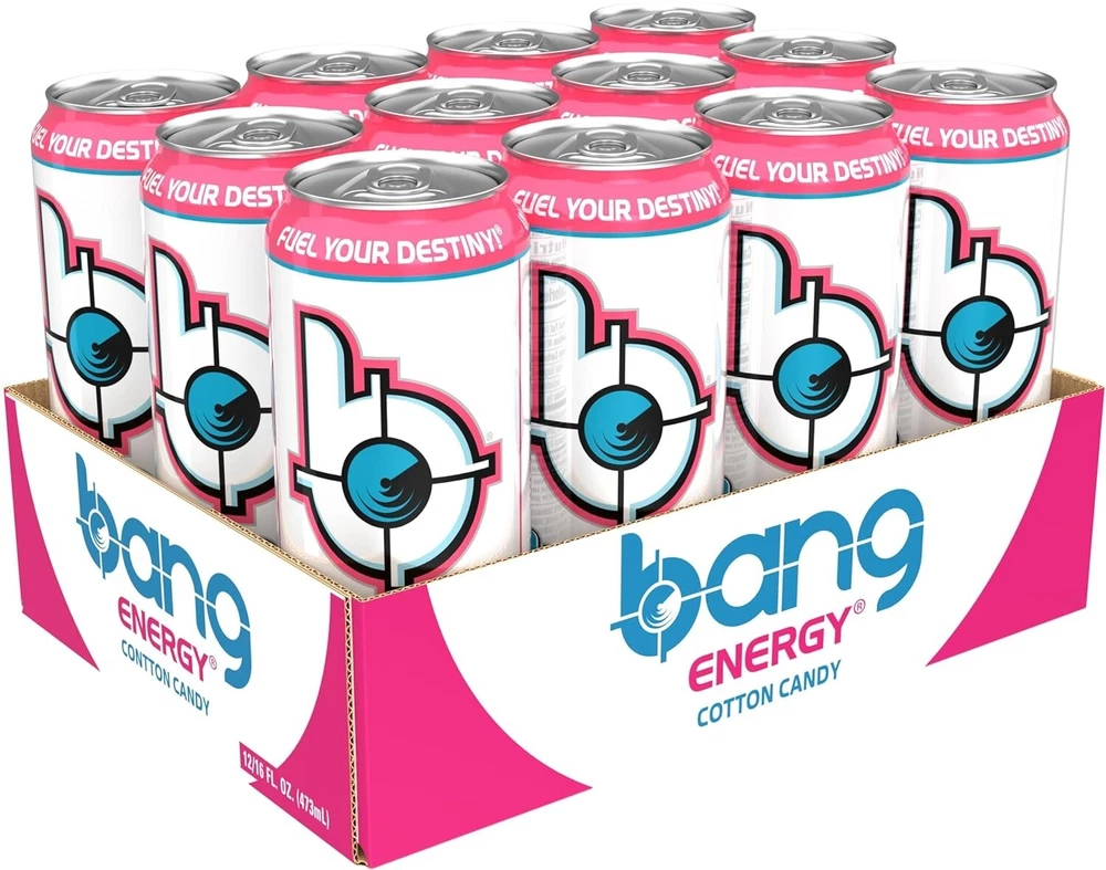 Ingredients carbonated water, natural flavors, citric acid, phosphoric acid, caffeine, sodium benzoate (preserves freshness), potassium citrate monohydrate, EAAs (L-leucine, L-isoleucine, L-valine, L-lysine, L-threonine, L-phenylanine, L-histidine, L-methionine, L-tryptophan), sucralose, potassium phosphate dibasic, vitamin C (ascorbic acid), potassium sorbate (preserves freshness), magnesium chloride, calcium chloride, calcium disodium EDTA, vitamin B3 (niacinamide), vitamin B6 (pyridoxine hydrochloride), and vitamin B12 (mthylcobalamin). About this item Brand BANG Item Form Liquid Flavor Cotton Candy Number of Items 12 Package Information Can 300 MG OF CAFFEINE: Bang Energy drinks contain enough caffeine to power you through any activity of the day. Stay energized for longer without the dreaded crash. ZERO-SUGAR ENERGY DRINK: NO sugar necessary Just great-tasting, sustained energy. ULTRA CoQ10 and EAAs (Essential Amino Acids) GLUTEN-FREE AND VEGAN-FRIENDLY: Bang Energy drinks are gluten-free and vegan-friendly, so they are perfect for any lifestyle or diet. ZERO CARBS, ZERO ARTIFICIAL COLORS and ZERO CALORIES. Product Description Only the reformulated Bang Energy drinks have been tested and verified to be gluten-free and vegan-friendly. If you receive cans that have “BCAA Aminos” instead of “EAA Aminos” printed on them, we cannot guarantee that they fall within the gluten-free and vegan-friendly guidelines. Bang is not your typical sugar-filled soda masquerading as an energy drink. Every 16-ounce can of Bang contains 300 milligrams of caffeine, which studies have shown may increase endurance, as well as strength in some cases, along with essential amino acids (EAA Aminos), CoQ10.< What’s more, Bang is sugar-free and has ZERO calories — yet it tastes great, with 21 different flavors to choose from and counting!