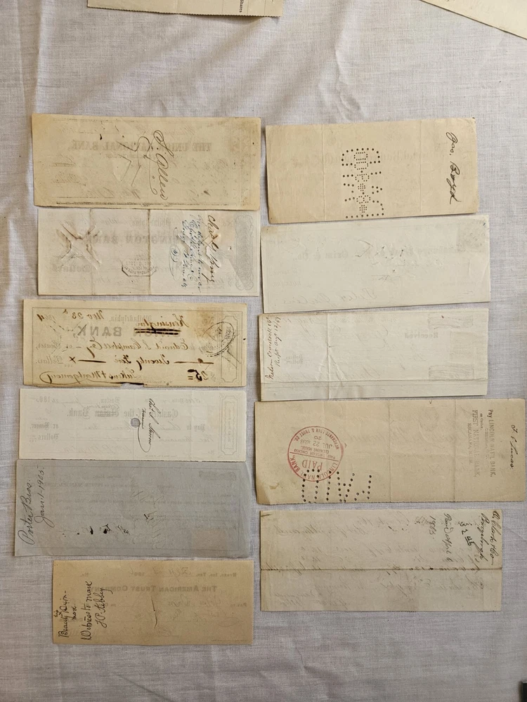 11 bank check and receipts with Revenue Stamps 1864 to 1906, as seen in the pictures The winner will receive all antique papers . Ground advantage with tracking. Please see the pictures . Please message if there's any questions.