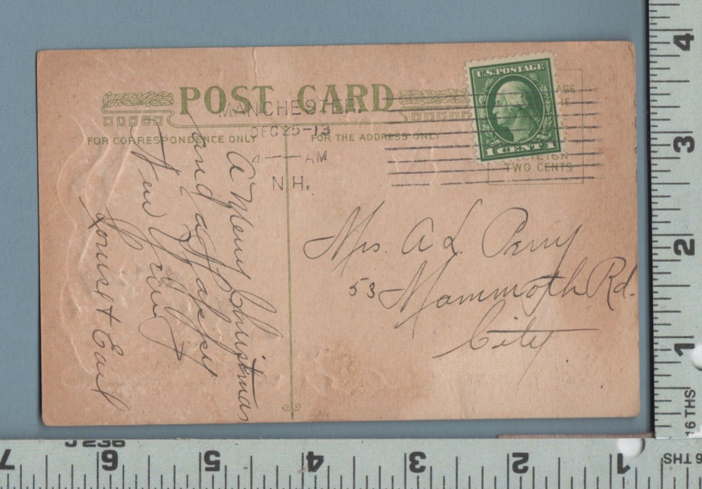 E227 Bank of Good Luck New Year greeting postcard A L Perry 53 Mammoth Rd Manchester NH Earl Sanborn Very good to excellent condition. Top mid edge w/ 3/4” light vertical crease. Reverse w/ some light age tone. Addressee: Mrs. A. L. Perry 53 Mammoth Rd. Manchester, N H Sender: Louise & Earl Sanborn, Manchester NH Image: Bank check of Good Luck from the Bank of Good Luck withing happy New Year. Pen signed by Mr. & Mrs. Earl Sanborn. New Year bells and holly w/ desert cake in lower right corner. Postal cancelation on 1 cent green George Washington postage stamp: Manchester NH Dec 25 1913 4 AM For more ephemera relating to family history genealogy biography bank check Bank of Good Luck embossed postcard New Year greeting post card Manchester, New Hampshire or ephemera in general, go to my eBay store: http://stores.ebay.com/Kit-Barry-Ephemera-Vintage-Paper No Stock Images are used in my descriptions. Item pictured = The item sold & the one you receive. Satisfaction guaranteed w/ return privilege for any reason. Buyer pays return shipping unless the return reason is for a mistake I made, in which case I reimburse the buyer’s return postage cost. For buyer purchased item, shipping within US is free to buyer. For foreign buyer, shipping abroad is $2.00+ depending on location & weight. All pieces are original to period. No reproductions sold in my store. Every day I try to add new listings to my eBay Auction & Store.