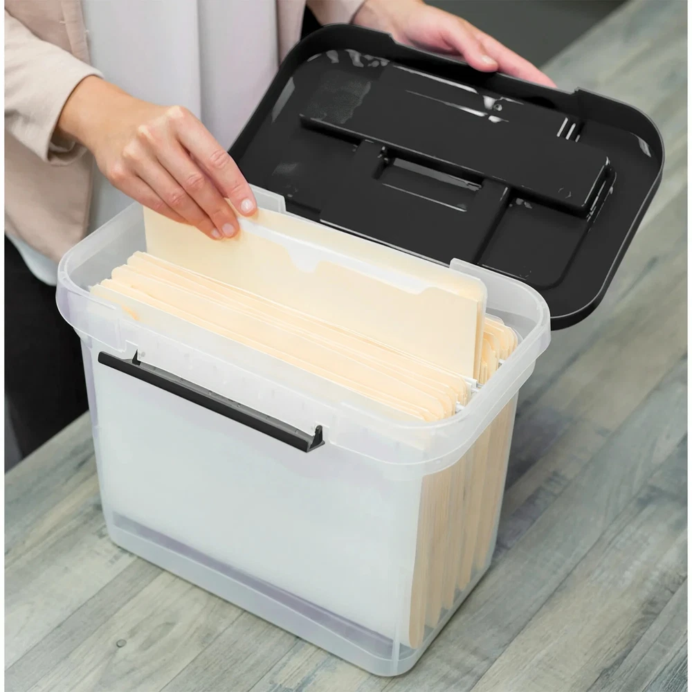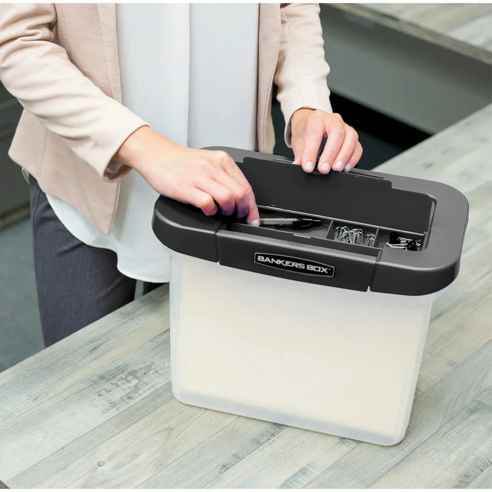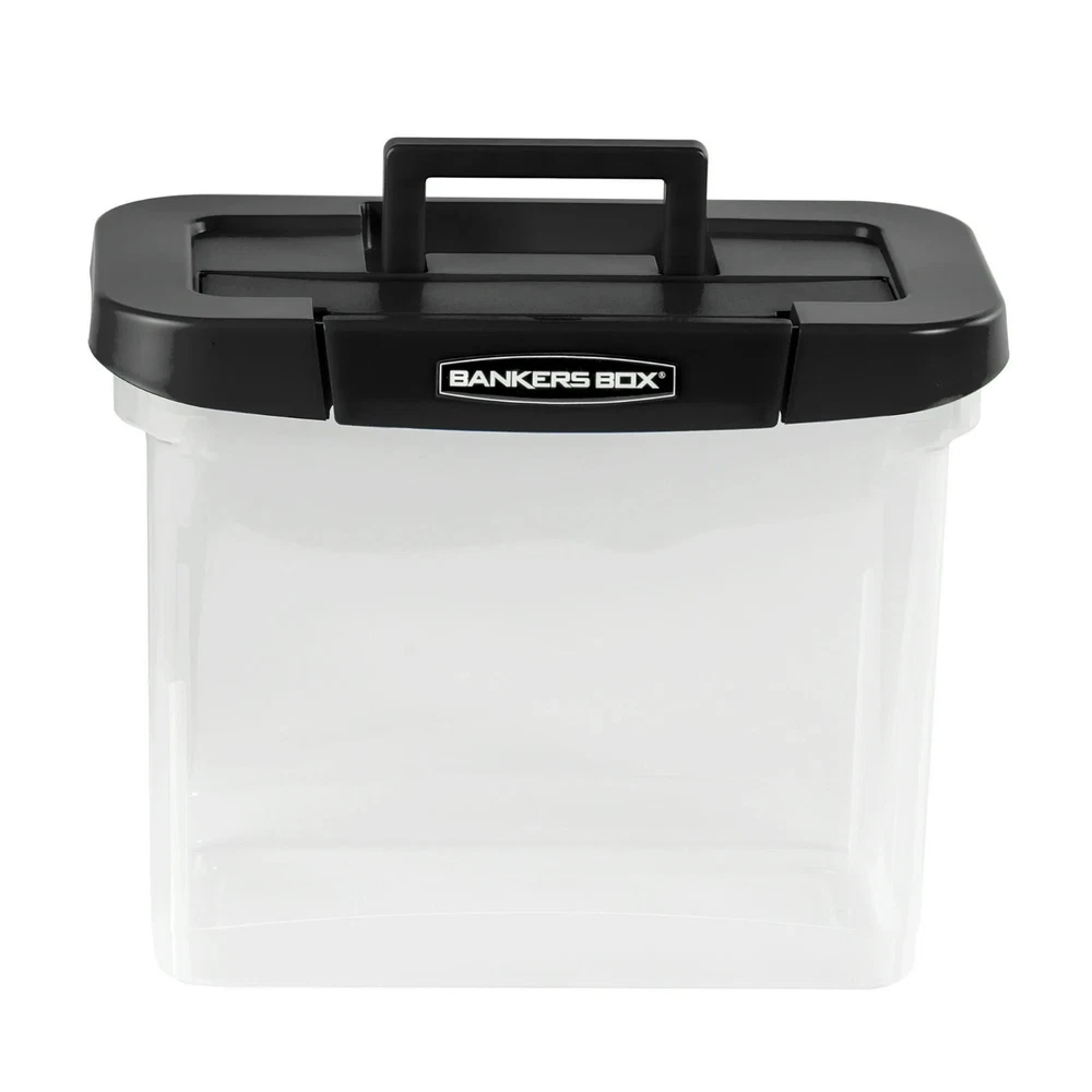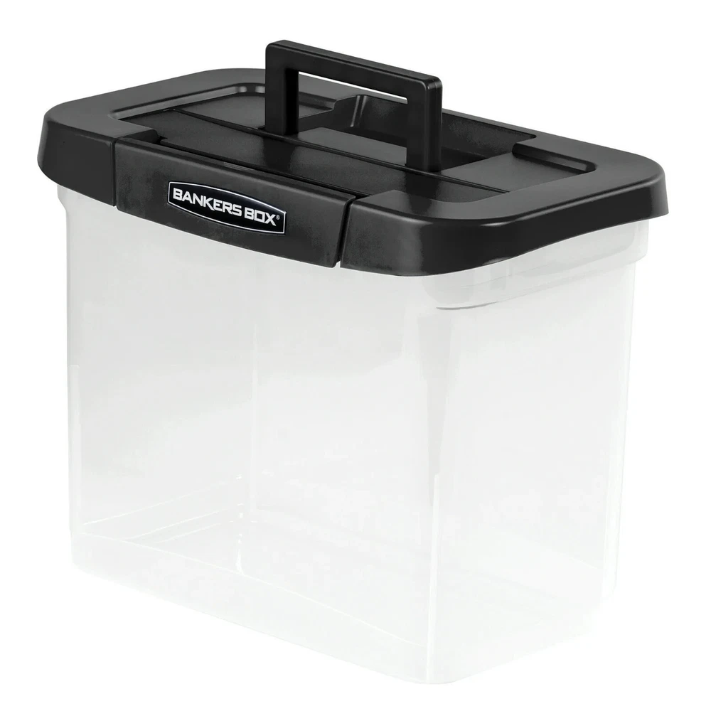Letter/Legal File Box features reinforced corners for added strength and a modular design makes them easy to stack. Built-in hanging rails keep files organized and accessible. Comfortable handles offer easy lifting and the locking lid ensures secure transport. TAA compliant. Inside dimensions are 6-3/4" x 11-3/4" x 10-3/4". Plastic storage boxes with lids provide organized and secure storage and transport of letter/legal size files. Durable plastic construction with reinforced corners for added strength - stacks up to 5 high. Modular design offers and easier way to stack. Bankers Box Plastic Letter Size File Organizer, Clear Portable file box provides organized and secure storage and transport of letter-size files Durable plastic construction with reinforced corners for added strength Modular design makes stacking easier Stacks up to 5 high Includes built-in hanging rails to keep files organized and accessible Comfortable handles for easy lifting Locking lid ensures secure transport TAA compliant Inside dimensions are 6-3/4" x 11-3/4" x 10-3/4"