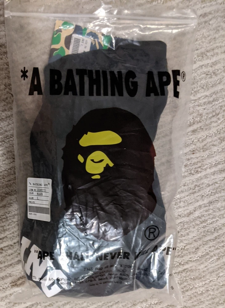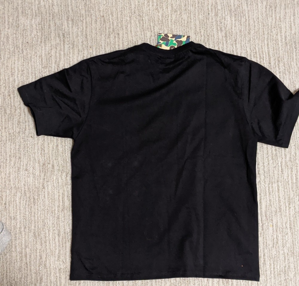This Bape T-shirt is a must-have for any designer-loving person . Featuring a camouflage pattern and short sleeves, this black cotton shirt is perfect for all seasons. The crew neck and regular fit make it a comfortable and stylish choice for men, while the A Bathing Ape brand adds a touch of uniqueness. The shirt is available in size Large . Whether you're a fan of the movie or just love the design, this T-shirt is a great addition to your wardrobe.