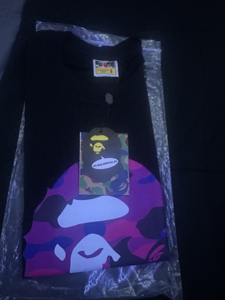 The Bape shirt is a brand new size small black t-shirt with short sleeves and a crew neck. Made of cotton, this designer piece features the iconic A Bathing Ape logo as accents. Manufactured in Japan in the 2020s, this regular fit shirt is perfect for the summer season. Machine washable and not vintage, this t-shirt is a stylish addition to any man's wardrobe.
