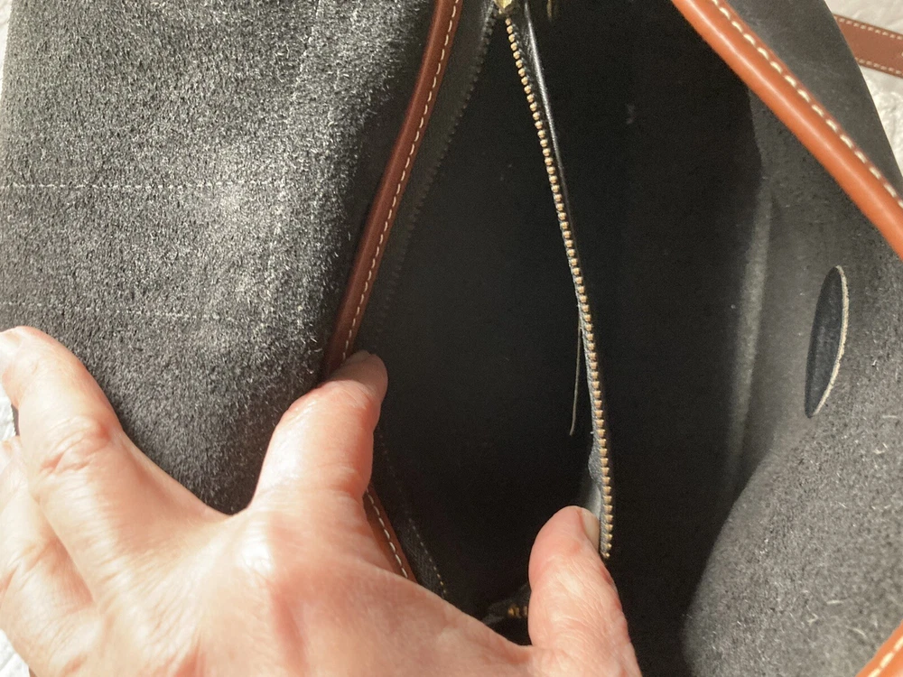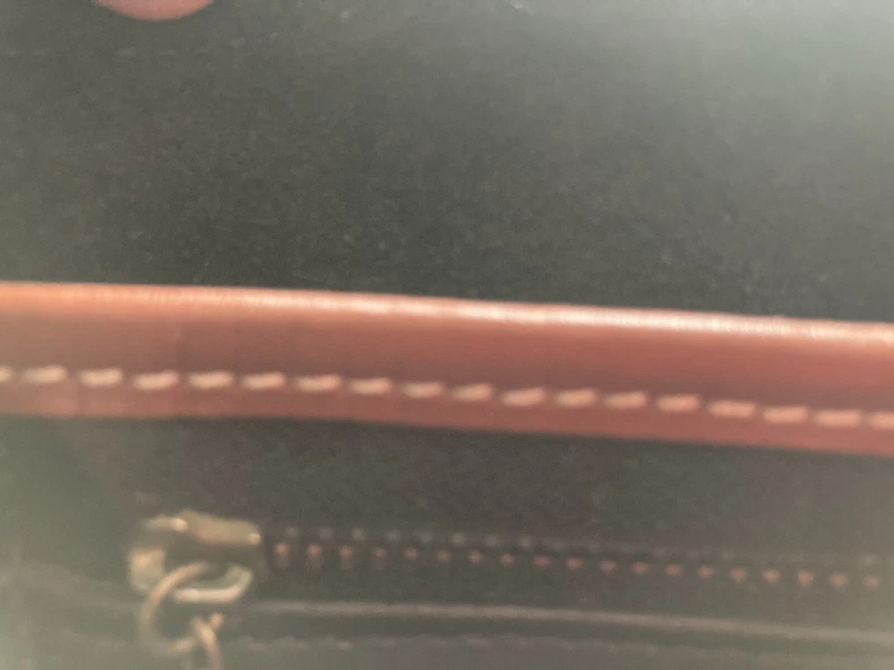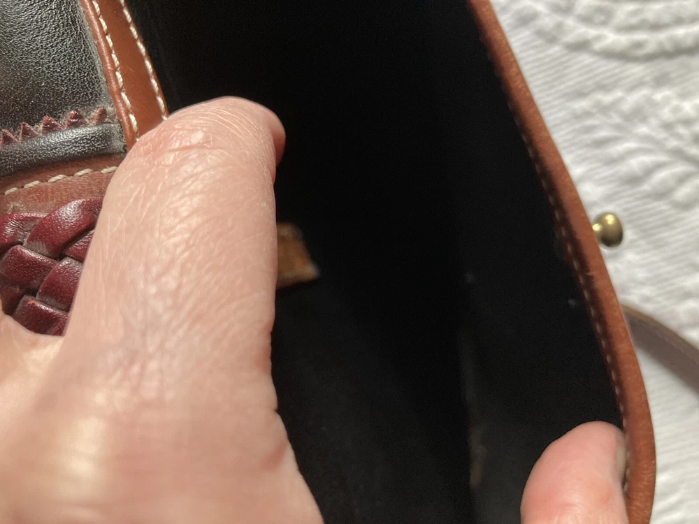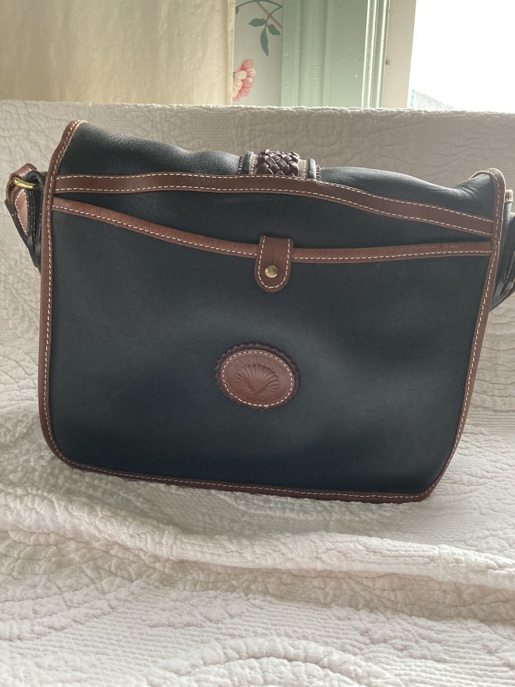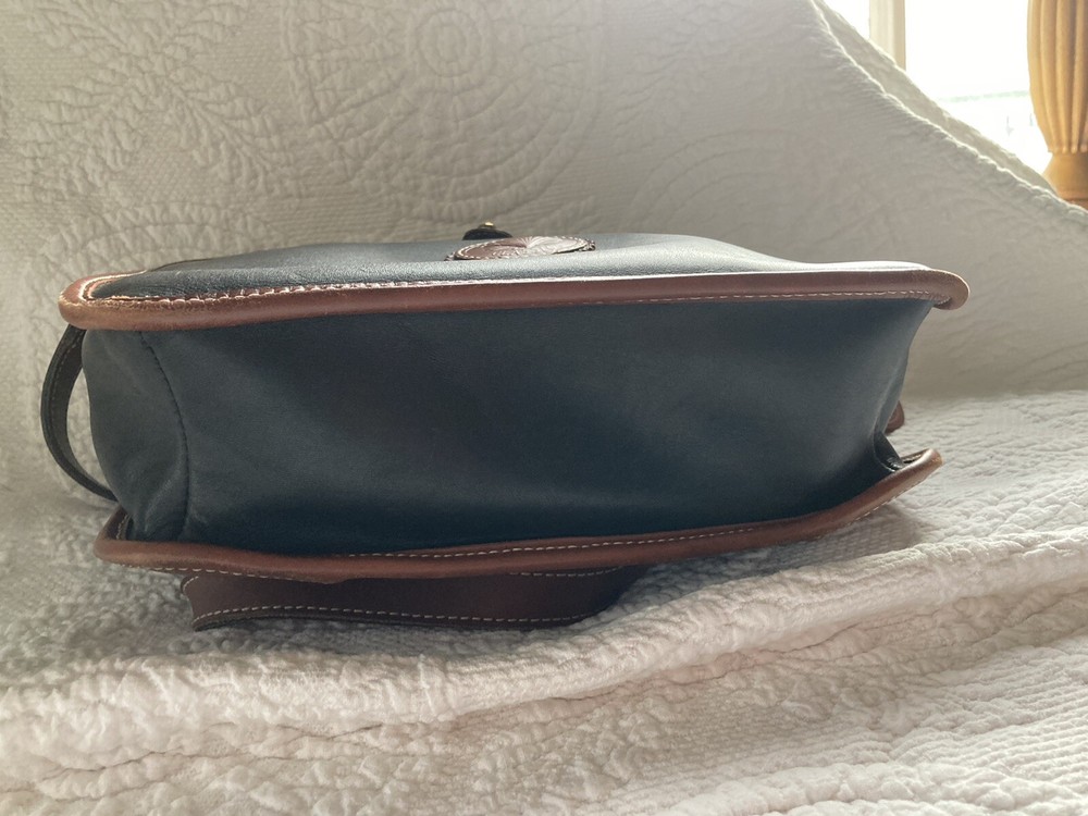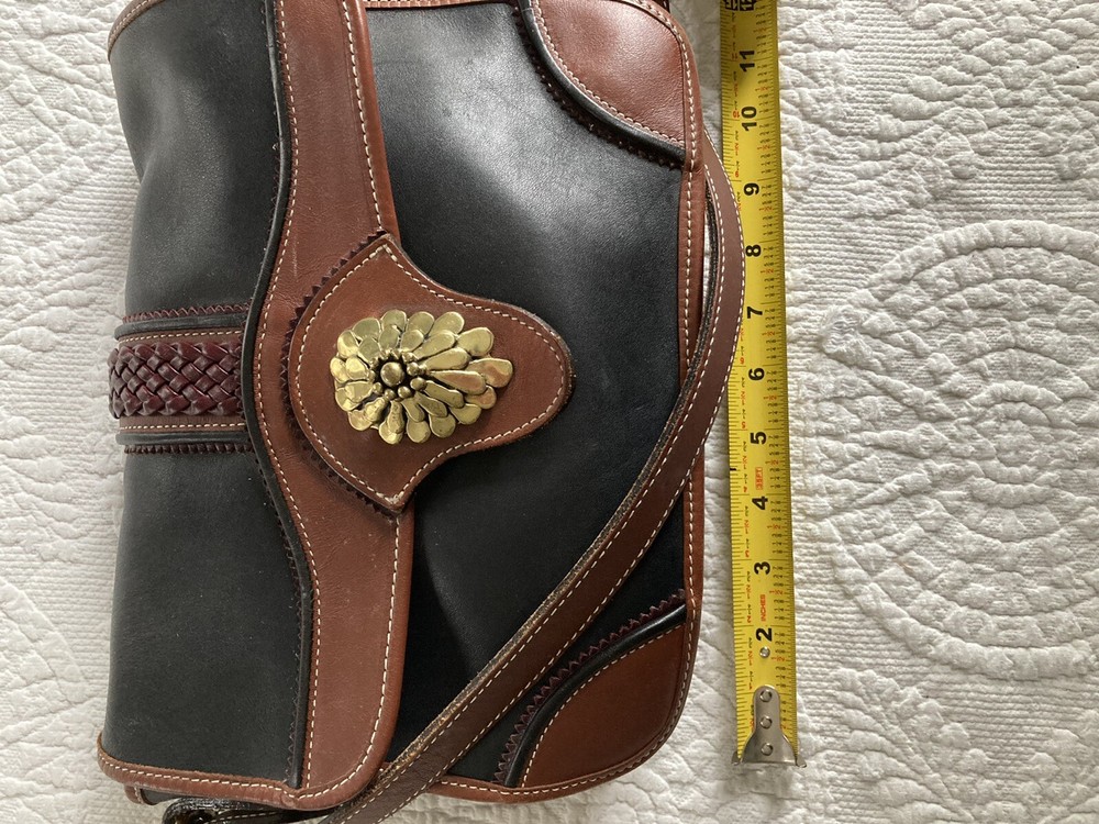 Bar Harbor Classics Leather and Brass Purse. Purse is in good used condition--some scuffing on the bottom and strap. Some brass could use a little polishing but overall a nice piece. Front closure is magnetic and working. Interior has one main pocket, a small zippered pocket for valuables and another pocket behind the zippered one which runs the interior width of the purse. There is one exterior pocket with a small brass button closure. Exterior pocket runs the width of the purse. All seams are machine sewed.