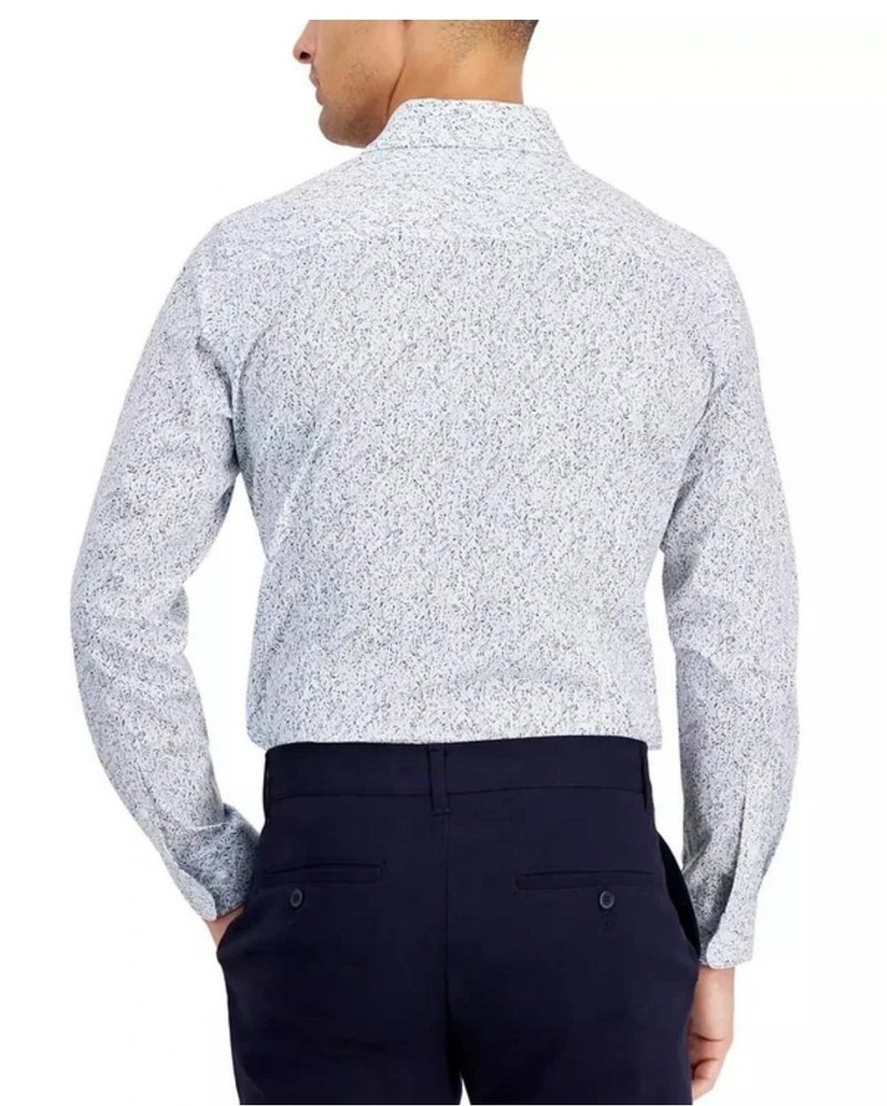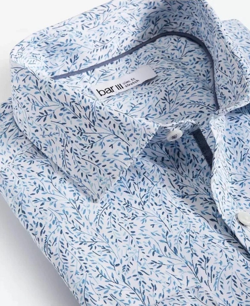 The Bar III Men's Slim-Fit Floral Dress Shirt in White Blue, size S, is a stylish and sophisticated choice for men looking to make a statement with their outfit. Made from a blend of polyester, spandex, and cotton, this shirt offers a comfortable and high-quality fit. The slim fit and point collar add a modern touch to the classic dress shirt design, while the white color and vine pattern give it a versatile and elegant look. Perfect for both formal occasions or smart-casual events, this shirt is a wardrobe essential for any fashion-conscious man.
