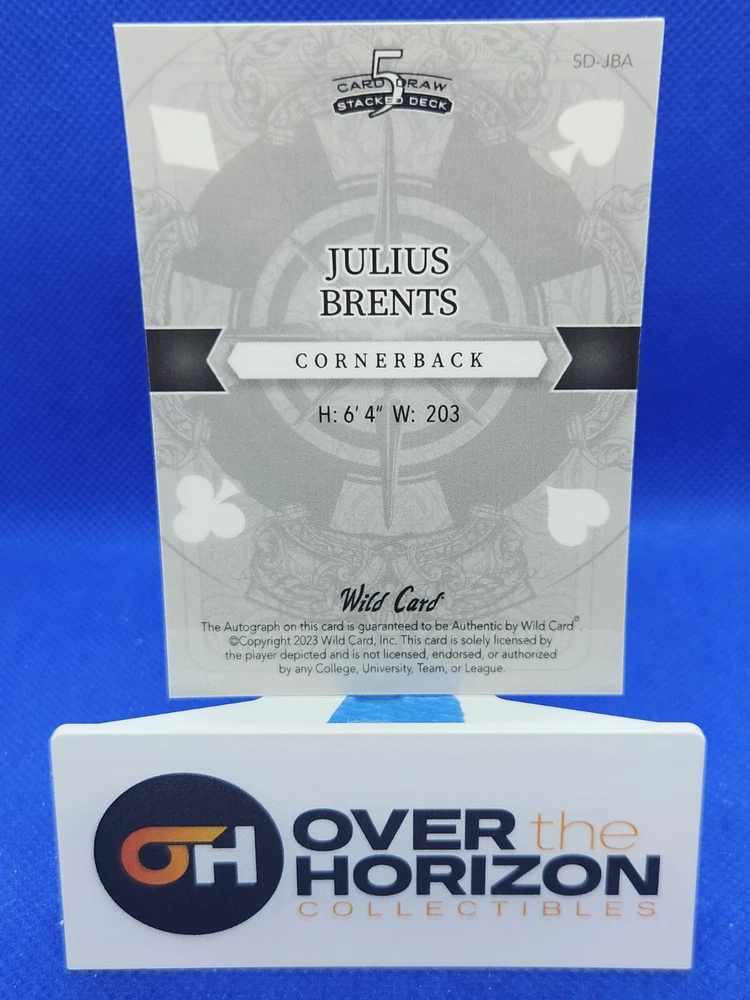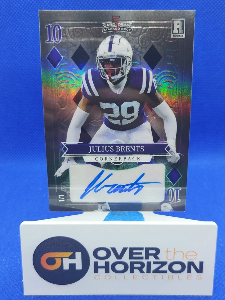 Get your hands on the rarest sports trading card of the year - the 2023 5 Card Draw Stacked Deck Julius Brent Black 10 Of Diamonds card. This limited edition card features the talented Julius Brents of the Indianapolis Colts and is a must-have for any NFL fan. The card is one of a kind, with a card number of 1/1 and is autographed by Brents using a label or sticker. It is a part of the National Football League (NFL) league and is a great addition to any sports trading card collection. Don't miss out on this one-of-a-kind collector's item!