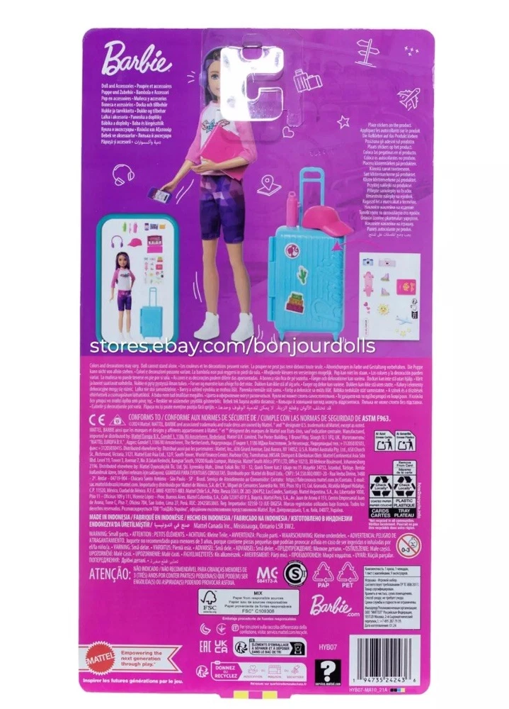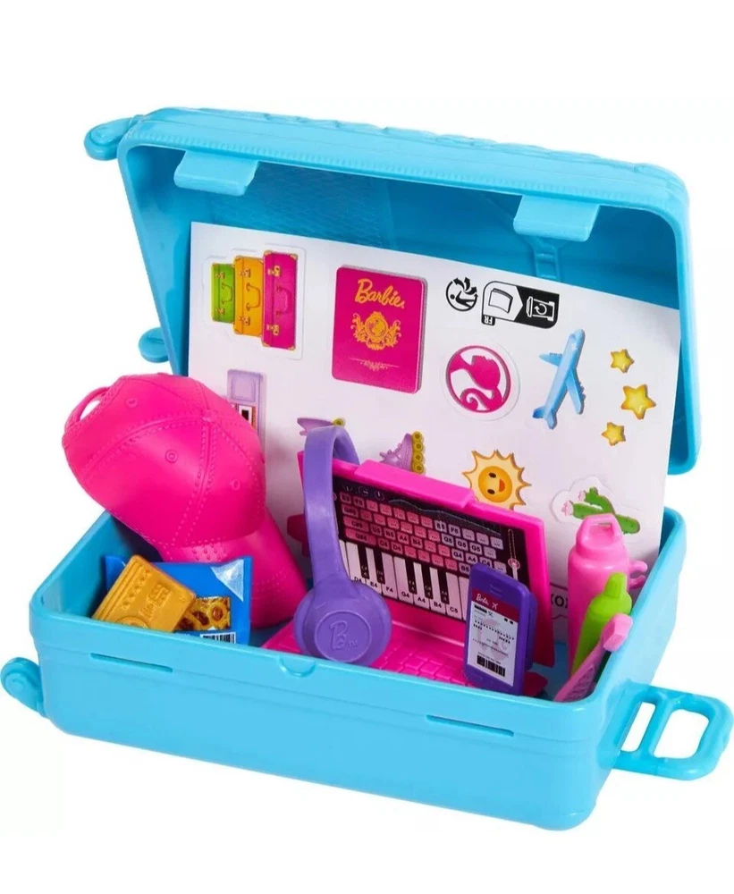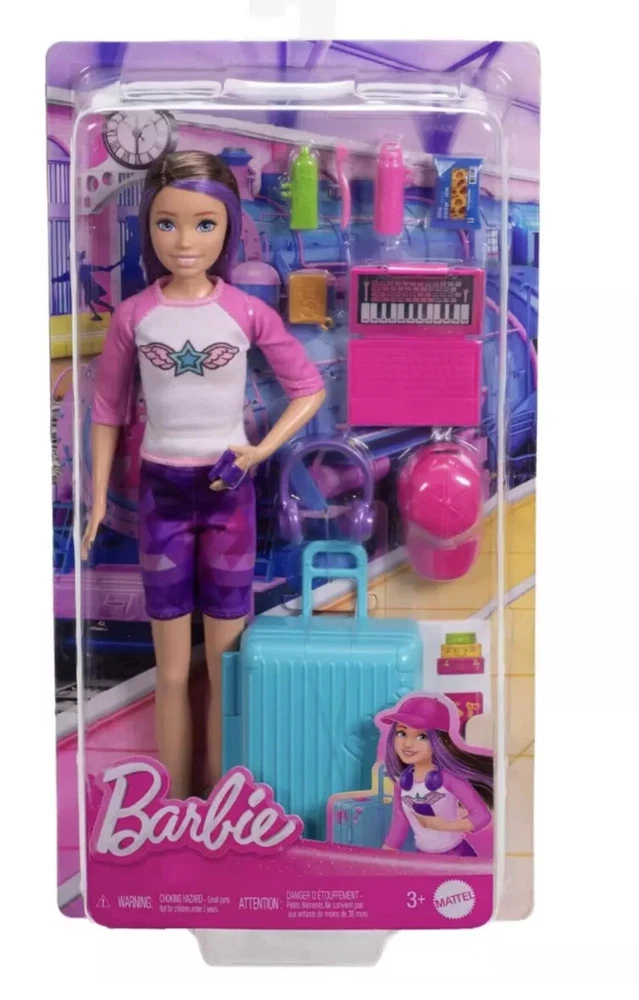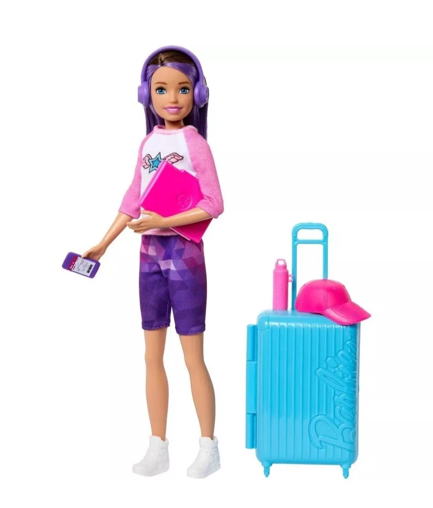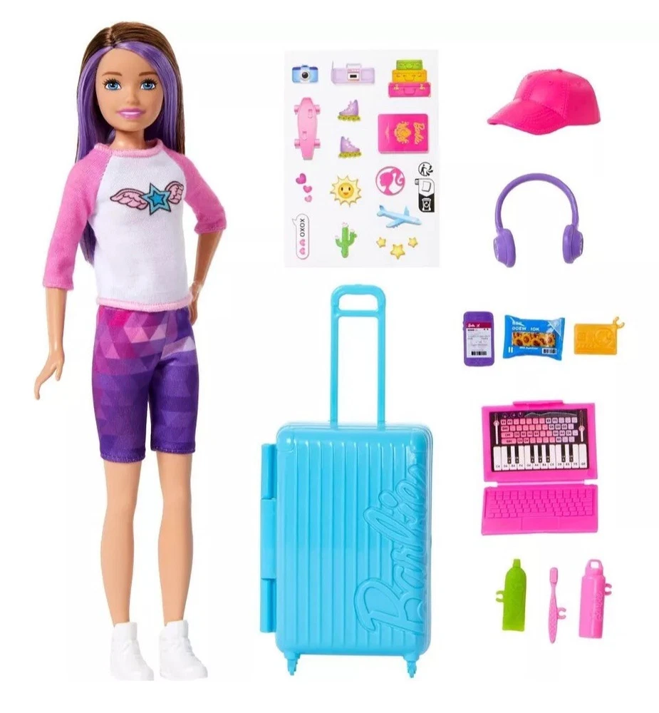 Skipper doll is ready for travel adventures! • With luggage that really opens and closes, kids can help her pack for adventures anywhere • The set includes accessories like a laptop, headphones, snack, toothpaste, water bottle, and more • A sticker sheet is also included to customize Skipper doll's luggage • Kids (ages 3 years old and up) can let their imaginations wander with Barbie!