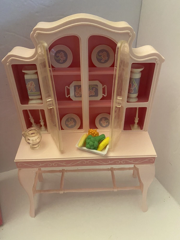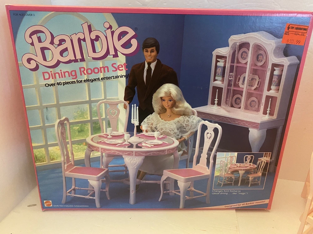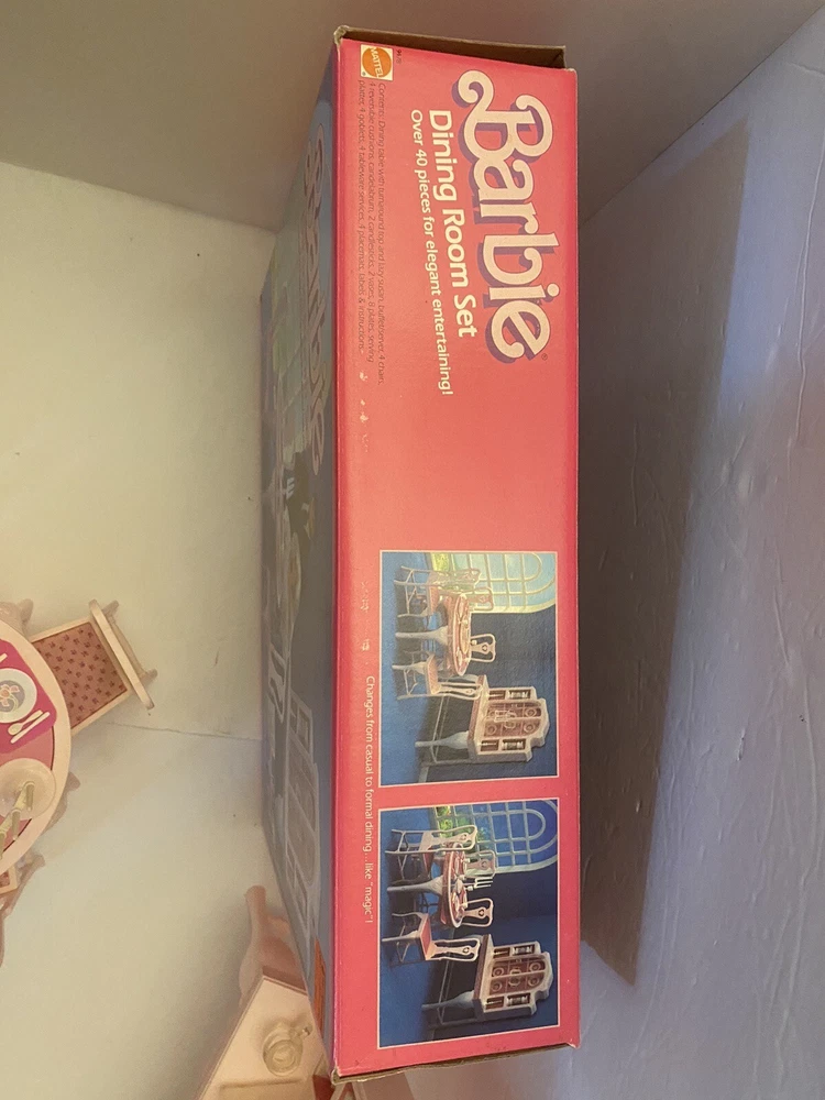 Barbie 1985 Dining Room Set- complete set includes: dining table with reversible top and lazy Susan (works well), buffet/server, 4 chairs, 4 reversible cushions, candelabrum, 2 candlesticks, 2 vases, 8 plates, serving platter, 4 goblets, 4 sets of silverware, 4 placemats and original instructions. Also comes with mini food pictured. Comes in original box which is in good condition. Please let me know if you have any questions!