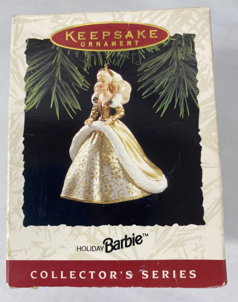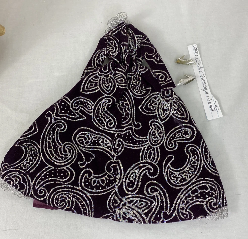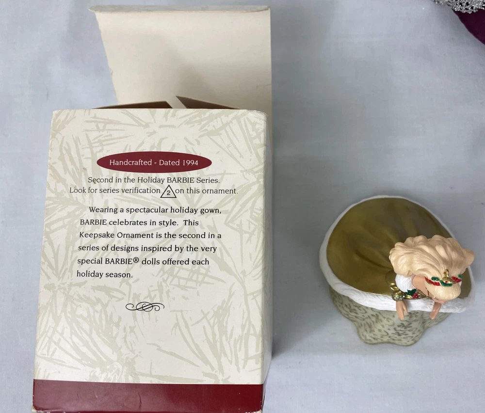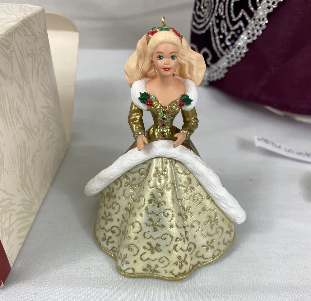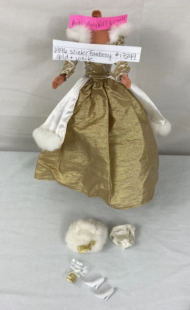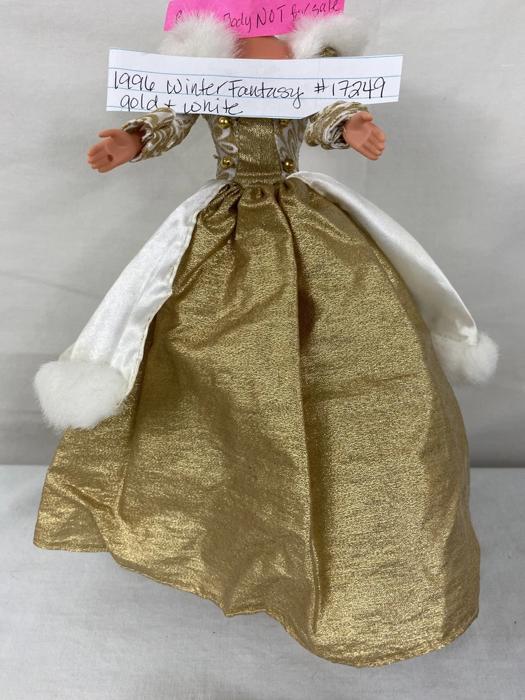 This product is a lot of two Barbie dolls dresses; one in gold and white the other in maroon and silver. Winter Fantasy gowns, along with a 1994 Barbie Hallmark Keepsake Holiday Ornament are complementary to any collection. The dresses are compatible with a 12in size doll/Barbie and are original, licensed reproductions from the Barbie Holiday product line. The gowns are made of cloth, the ornament is plastic, and glitter, and the ornament is in its original packaging. The lot is perfect for celebration occasions and features lightweight dolls with a fashion doll type. The dolls are from the 1990-1999 time period and were manufactured in Indonesia. See pictures as they are part of the description. More pictures available. Sold as is.