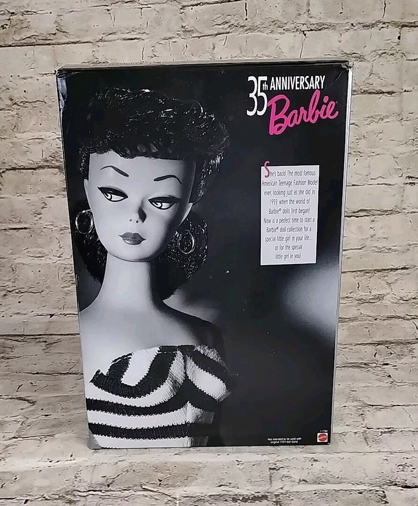 Celebrate a milestone in toy history with the Barbie 35th Anniversary Brunette doll, a charming reproduction of the 1959 original. This special edition doll, numbered #11782 and manufactured in 1993, comes new in box, preserving the timeless beauty and elegance that Barbie has been known for over the decades. With dark brown hair and a light complexion, this 11.5" fashion doll is dressed in removable attire, showcasing the sophistication of the era and the quality craftsmanship of Mattel. Included in this set are the doll and its accessories, all presented in the original, unopened packaging. This collectible Barbie, a part of the Anniversary Dolls product line, is a must-have for enthusiasts and collectors. It's not just a toy; it's a piece of history that captures the essence of fashion and beauty across generations. Whether for display or play, this Barbie is a treasure for anyone who appreciates the blend of nostalgia and style.
