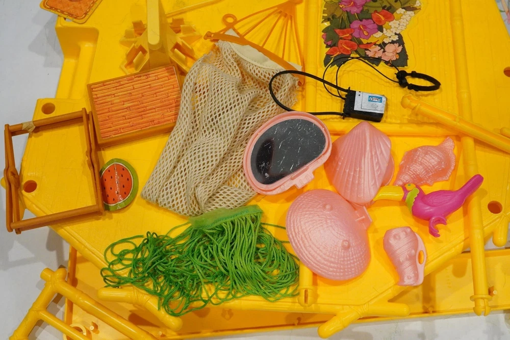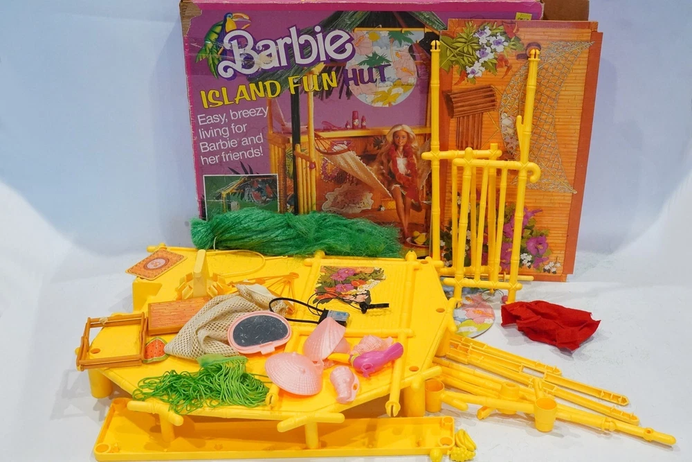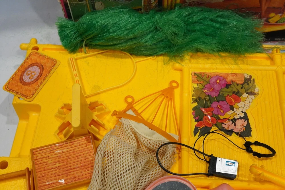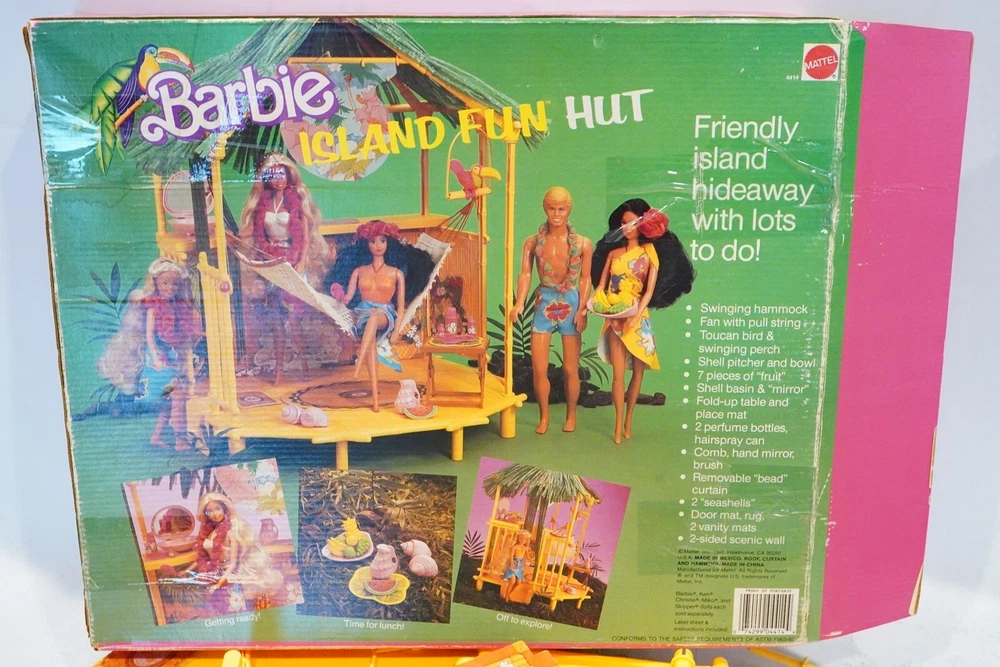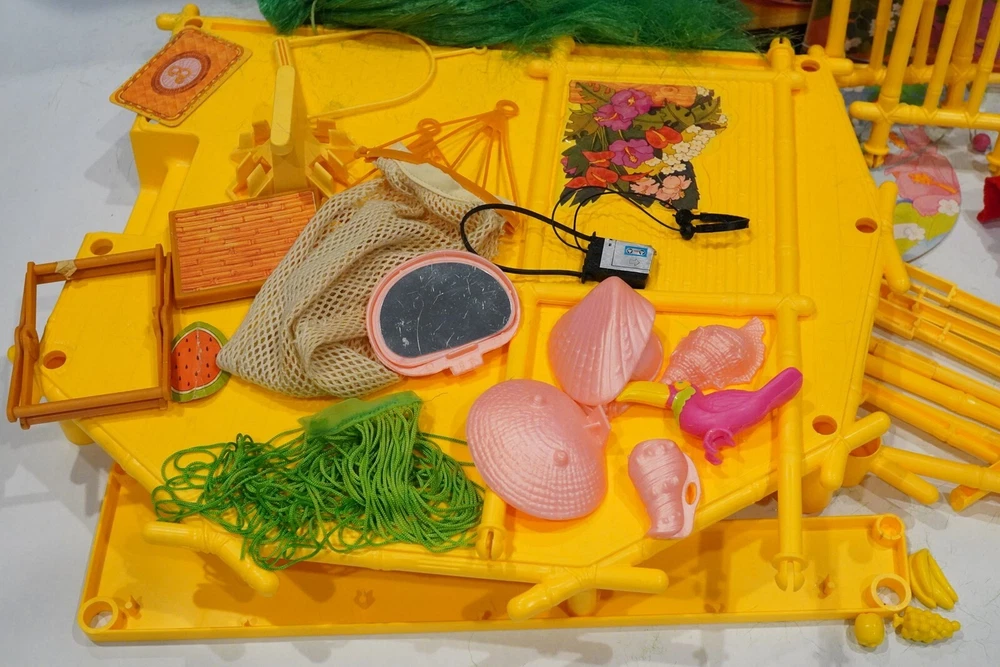 This listing is for a used Vintage Barbie Island Fun Hut Playset #4414. This set is nearly complete, which only a few accessories missing, like the hairbrush, comb, perfume bottles, and hairspray can. Some extra accessories are included. Please note that one of the pegs on the posts is broken, which can be seen in the photos. Also, the green grass cover has become brittle and displaces fibers. It will be plaecd in a separate bag. The original box is included as well. Don't pass up the opportunity to purchase this item for a great price! The item will be packaged securely to prevent damage. Shipping is free to anywhere in the United States. International buyers, please contact me regarding shipping, as prices vary by country. I accept payment by Paypal only. I only accept Paypal from users with CONFIRMED ADDRESSES. The item will be shipped on the same or following day that the payment is received, depending on the time that it is received. Winning bidder must send payment within 5 days. Please feel free to message me if you have any questions.