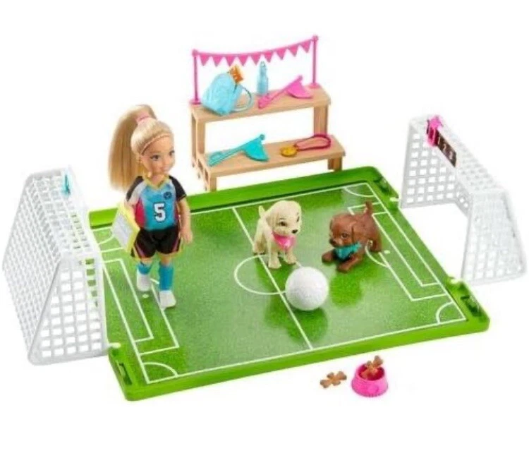 Barbie Dreamhouse Adventures Chelsea Doll Soccer Playset Blonde hair Blue eyes. Playset includes: Two goals, each with an adjustable scoring board, attach to a field area where Chelsea can practice and play -press down on her shoulders for "kicking" action! Two puppy friends with sporty bandanas can join in the fun, and a set of bleachers provides seating for fans and friends (not included). Includes storytelling accessories, like a gold medal, backpack, water bottle, snacks and a ball. Chelsea doll is game-ready in a colorful soccer jersey with sporty stripes, matching shorts, shin guards and shoes Shipping costs includes supplies plus postage