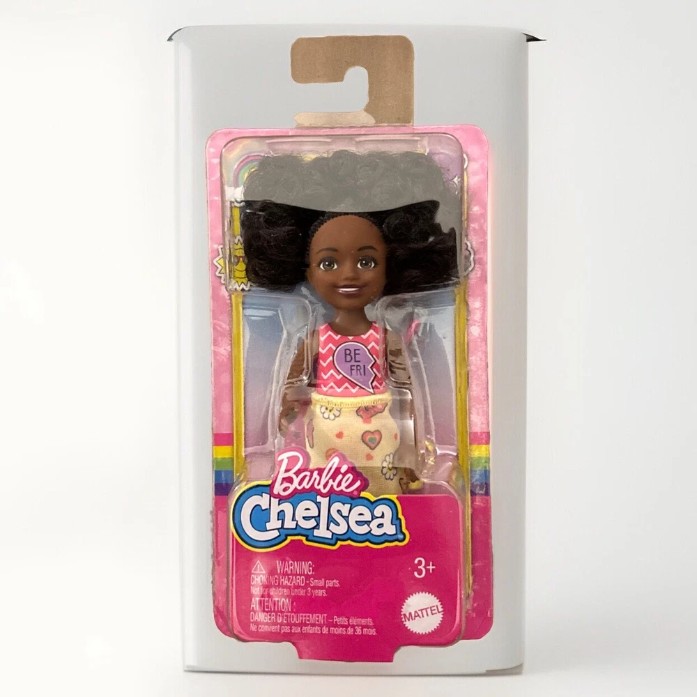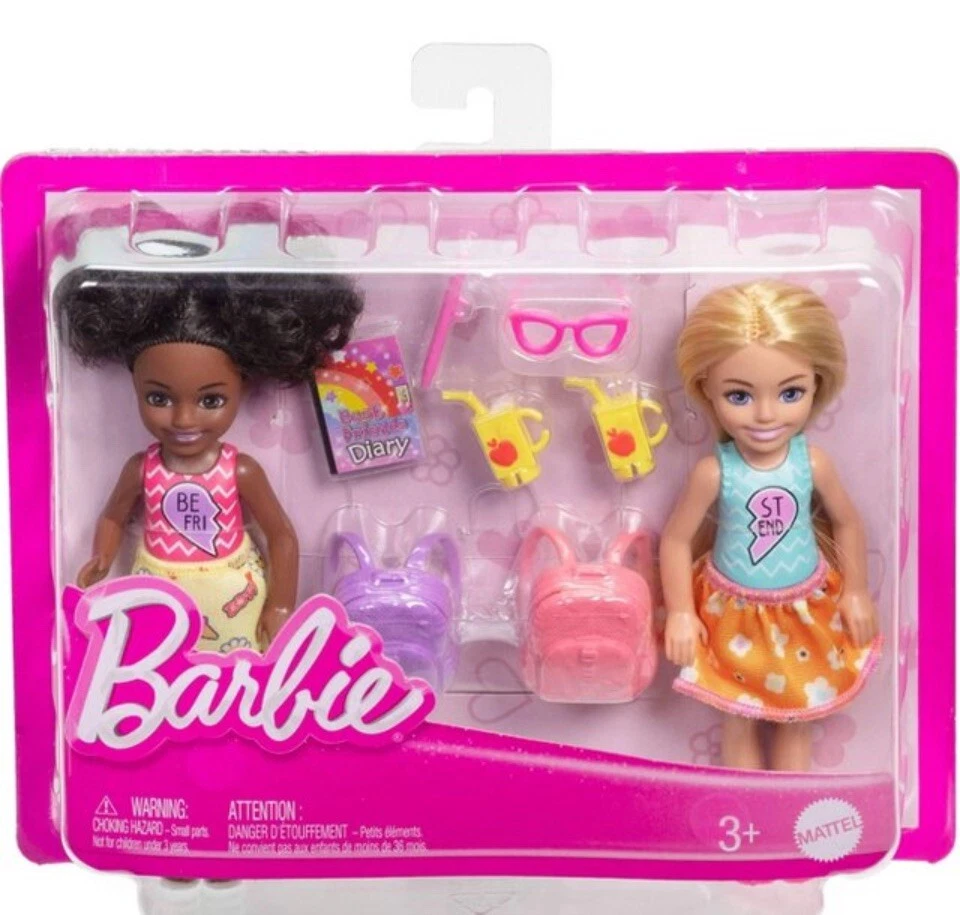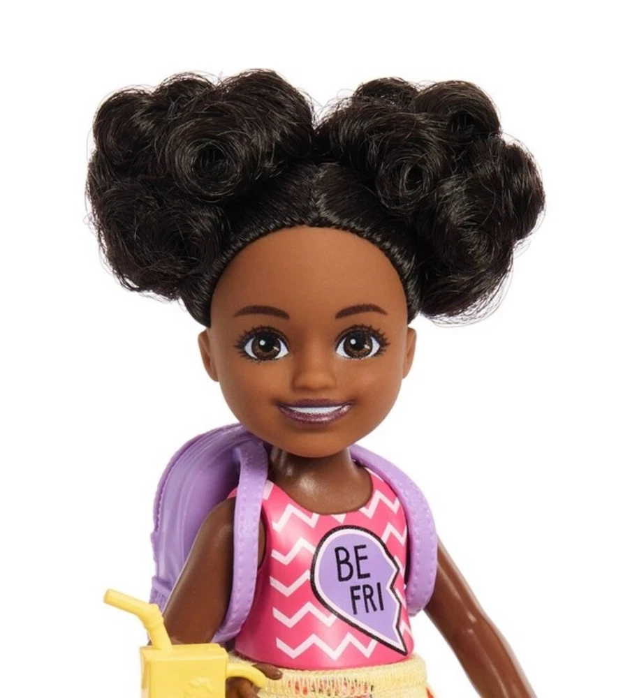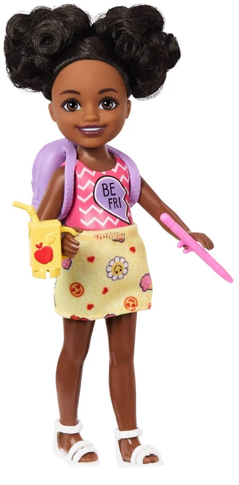 Part of The Barbie Chelsea Play Together set doll has been removed from original packaging and repackaged in Barbie ZipperCase with all accessories shown in pictures. The doll sports a matching half of a best friend heart on their bodice and wears a removable skirt with adorable print and shoes. Accessories included are a juice box the small doll can hold and a backpack that really store items inside!