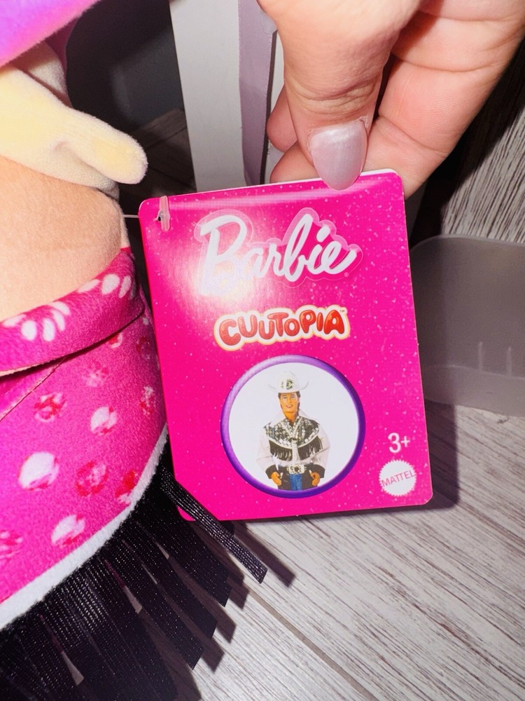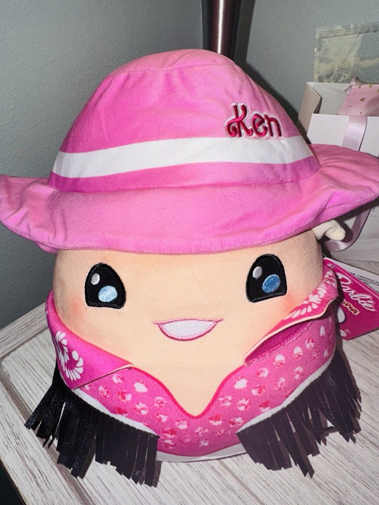 This is a 14" Barbie Cutopia plush toy of Cowboy Ken from the Squishmallows brand, designed for Valentine's Day 2023. The plush is pink in color and part of the Barbie character family. It is suitable for various age levels, including 1-2 years, 3-4 years, 4-7 years, 8-11 years, 12-16 years, and 17 years & up.