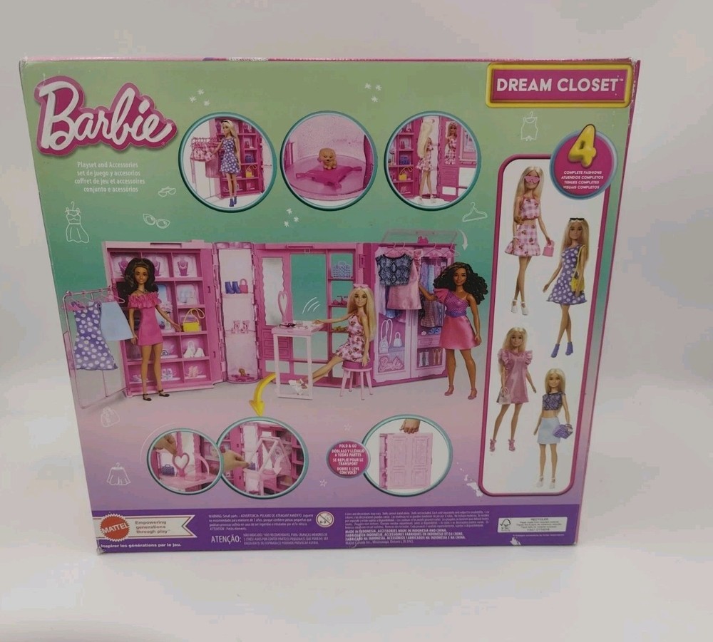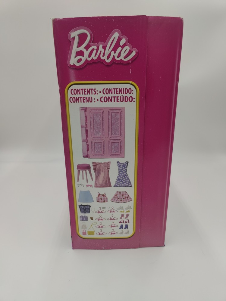 The Barbie Dream Closet Playset is a 3-foot wide wardrobe designed for Barbie dolls, featuring over 25 pieces of doll clothes and accessories. Made of pink plastic, this fashion doll playset includes a bedroom-themed room with an original Barbie brand design. Perfect for children ages 3 years and up, this Barbie franchise-inspired toy provides hours of imaginative play for young girls who love to dress up their dolls in stylish outfits. This doll house wardrobe set comes with its original packaging and is a must-have for any Barbie doll enthusiast.