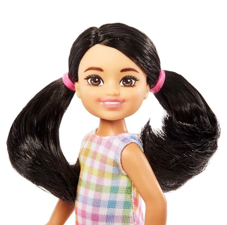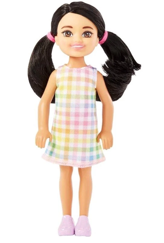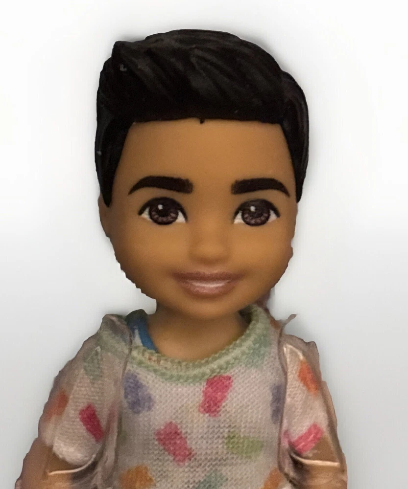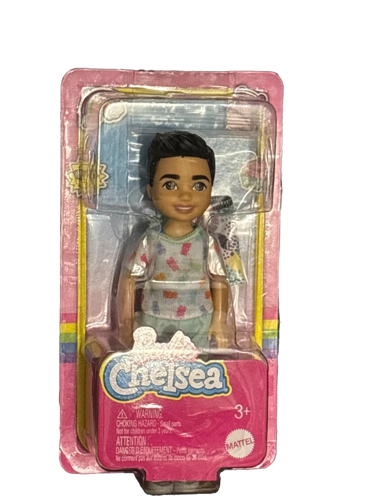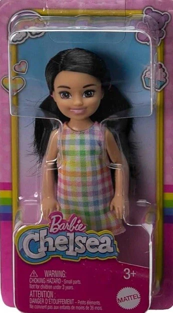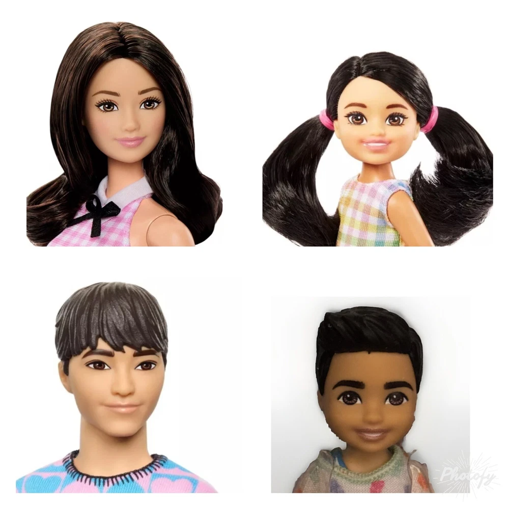 Lot of 4 Dolls includes one Barbie, Ken and two Chelsea Dolls. Inspired by her Quick Curl look from 1973, Barbie Fashionistas doll wears a pink gingham dress with sweet ruffle and bow-tie neck! White Mary Jane-style flats and a black bracelet are casual chic touches! Barbie doll wears her black hair styled with pretty curls to complete the look! Ken fashionista doll #219 wears a colorful patterned shirt with trendy hearts, flowers and Ken logo, paired with peach shorts. He has a slender body and black hair sculpted into a cool style. White boat shoes finish off the fun look. The 6-inch Chelsea doll is super-cute in a white dress with pastel plaid print. Chelsea doll's black hair is styled in 2 pigtails, and purple shoes complete her look. Added diversity and more variety in looks and hairstyles provide infinitely more ways to spark imaginations and play out unlimited stories. The 6 inch Chelsea Boy Darrin doll is ready for the beach! With his toucan top and removable floral print swim trunks. Doll has been redressed in gummy bear outfit with white gym shoes and repackaged.