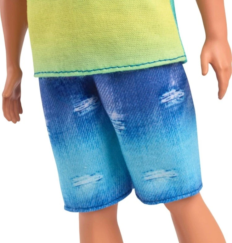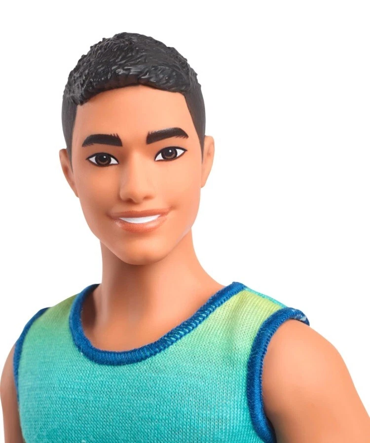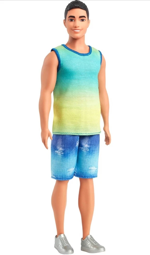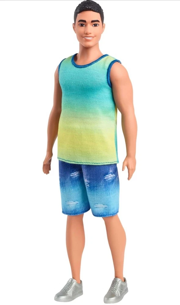 Barbie Fashionistas Ken Doll #236 with Black Hair in Blue & Green Ombré Shirt and jean shorts. This Ken doll has a broad body type and wears a blue green ombre tank that really makes his personality pop! Distressed jean shorts suit his ombre tank perfectly, while silver sneakers complete his versatile and stylish outfit. From meeting up with friends to hanging out at the beach, this Ken doll is dressed for any adventure that kids dream up!