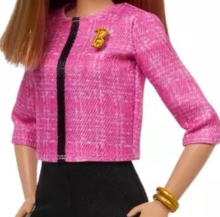Inspire young leaders with this Barbie Future Leader dress suit. Barbie doll is ready to take the lead in a one piece pink blazer top and black skirt the outfit is paired with a pair of black heels, two golden bracelets and 'B' pin! Perfect complete look for your doll. Clothes have been removed from the doll but not played with.