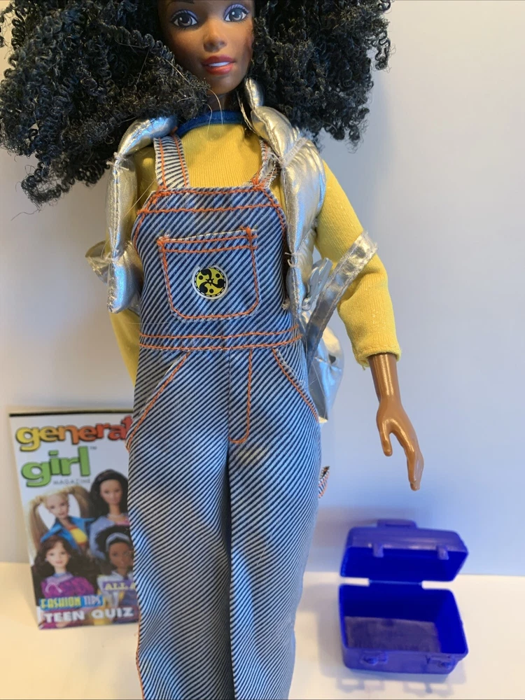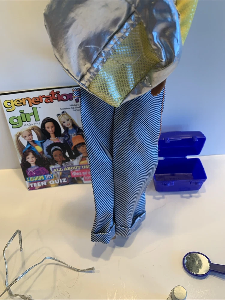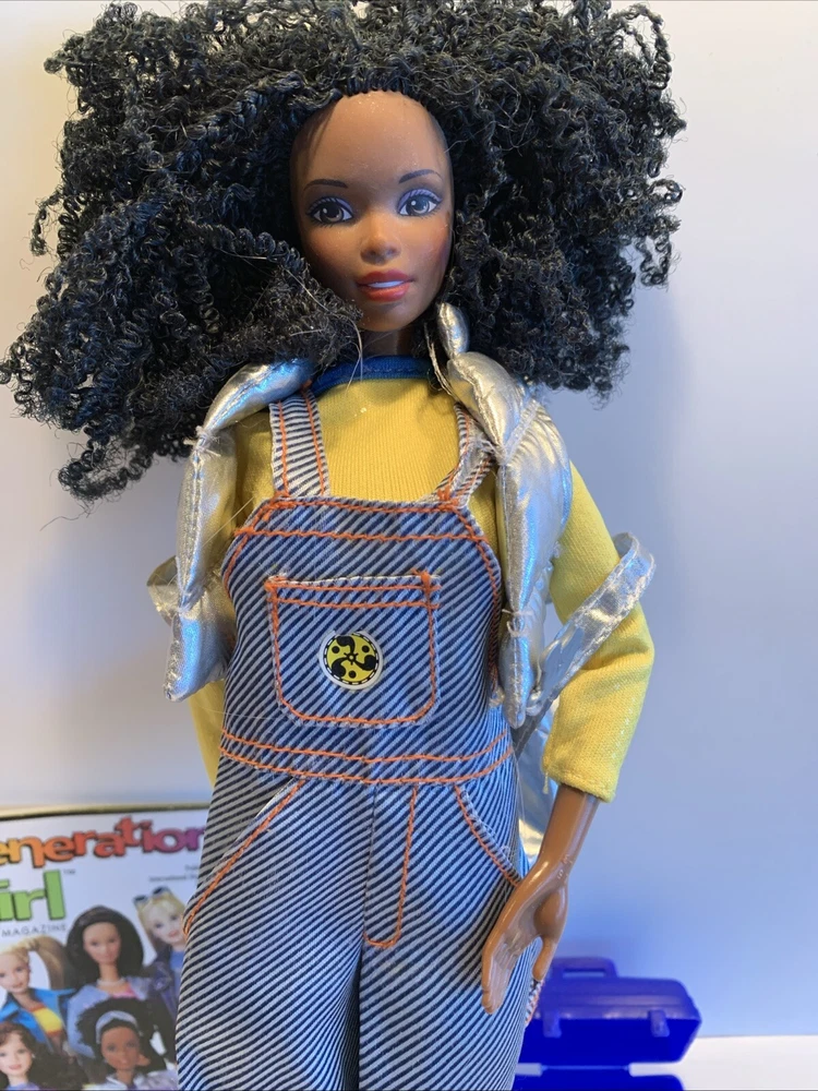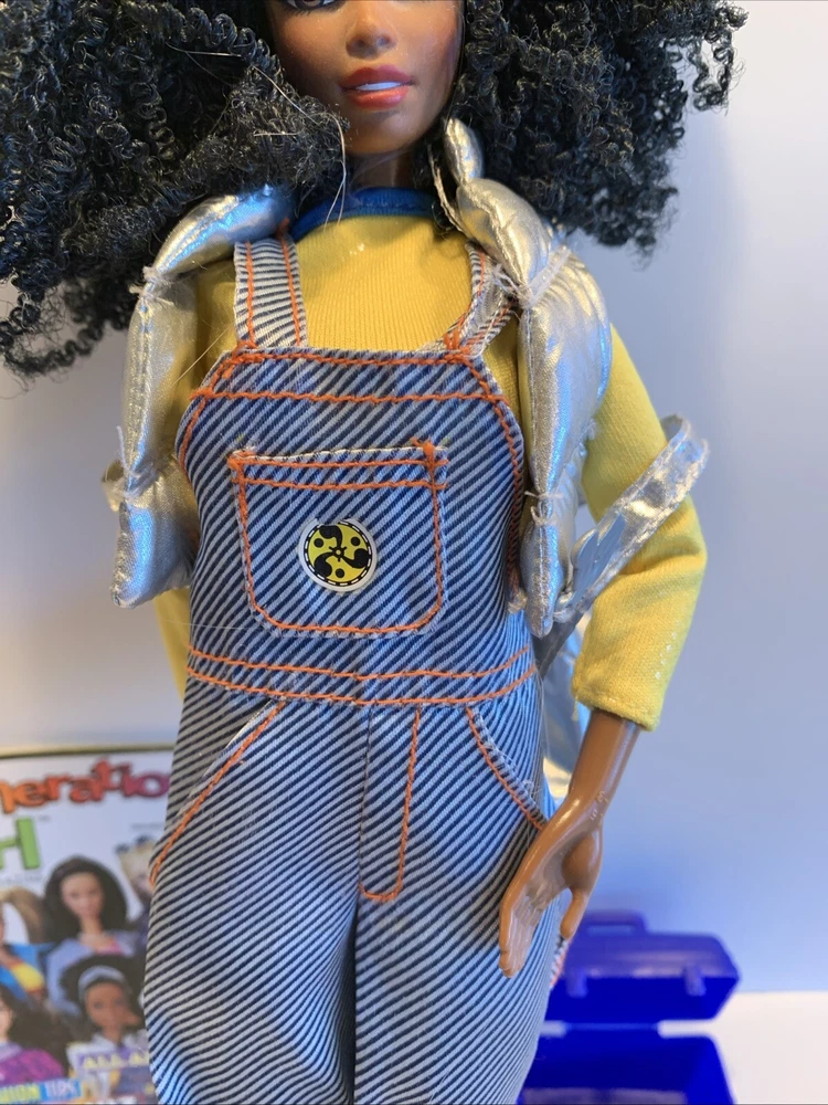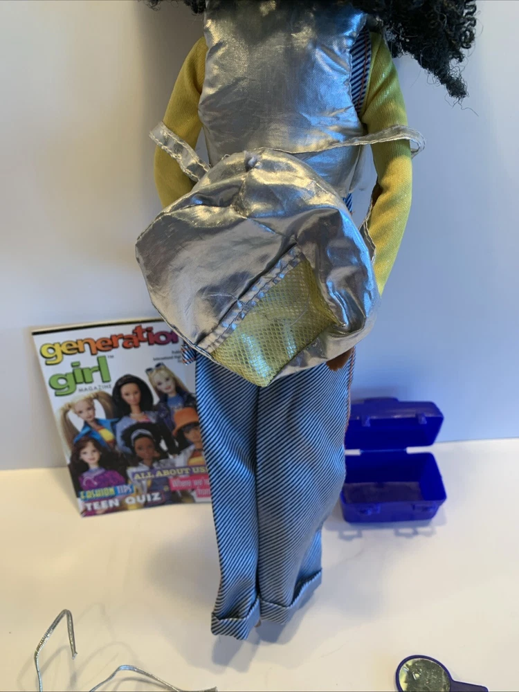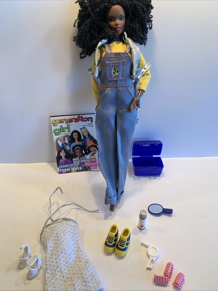 Embrace the nostalgia with the Barbie Generation Girl Nichelle doll, a cherished collectible from Mattel, complete with fashion-forward attire and accessories. This 1999 ensemble features Nichelle dressed in casual attire, including a fashionable vest, overalls, and a coordinating dress, all complemented by a backpack and shoes that perfectly capture the essence of the era. Designed for the 11-inch fashion doll, this outfit set is a testament to the African American character's timeless style. It's an original piece from the 1990-1999 time period, offering a glimpse into the fashion and beauty themes that Barbie represents. This doll, clothes, and accessories set is a must-have for collectors and fans of the iconic brand, making it an exceptional find for anyone looking to add a touch of the late '90s to their collection. Has rollers, blow dryer, mirror, hairspray, case, White dress, with white heels, Water bottle Backpack