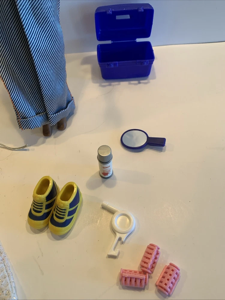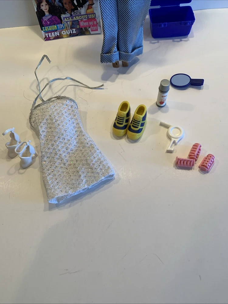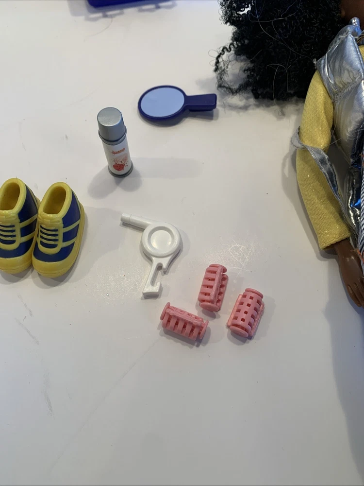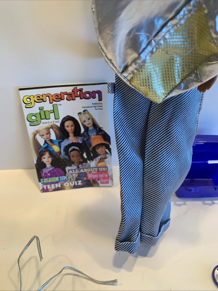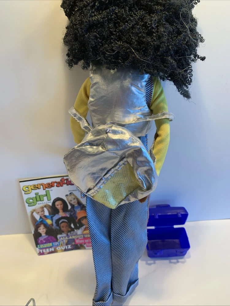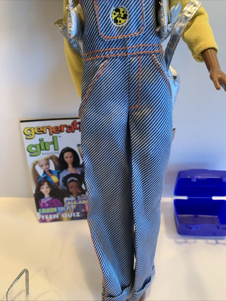 Embrace the nostalgia with the Barbie Generation Girl Nichelle doll, a cherished collectible from Mattel, complete with fashion-forward attire and accessories. This 1999 ensemble features Nichelle dressed in casual attire, including a fashionable vest, overalls, and a coordinating dress, all complemented by a backpack and shoes that perfectly capture the essence of the era. Designed for the 11-inch fashion doll, this outfit set is a testament to the African American character's timeless style. It's an original piece from the 1990-1999 time period, offering a glimpse into the fashion and beauty themes that Barbie represents. This doll, clothes, and accessories set is a must-have for collectors and fans of the iconic brand, making it an exceptional find for anyone looking to add a touch of the late '90s to their collection. Has rollers, blow dryer, mirror, hairspray, case, White dress, with white heels, Water bottle Backpack