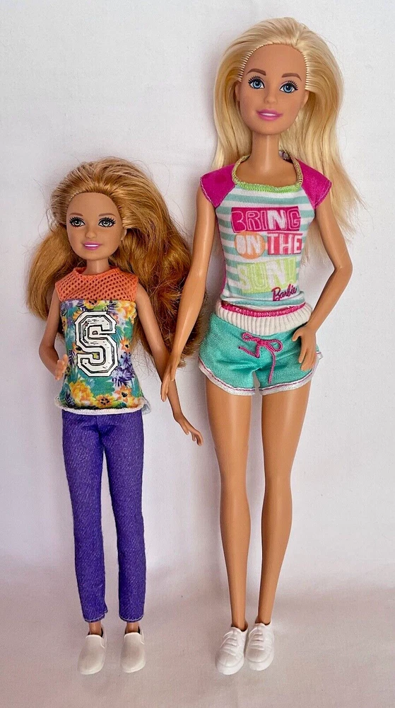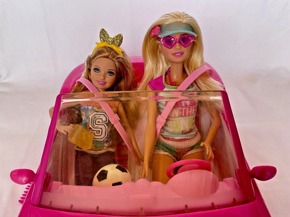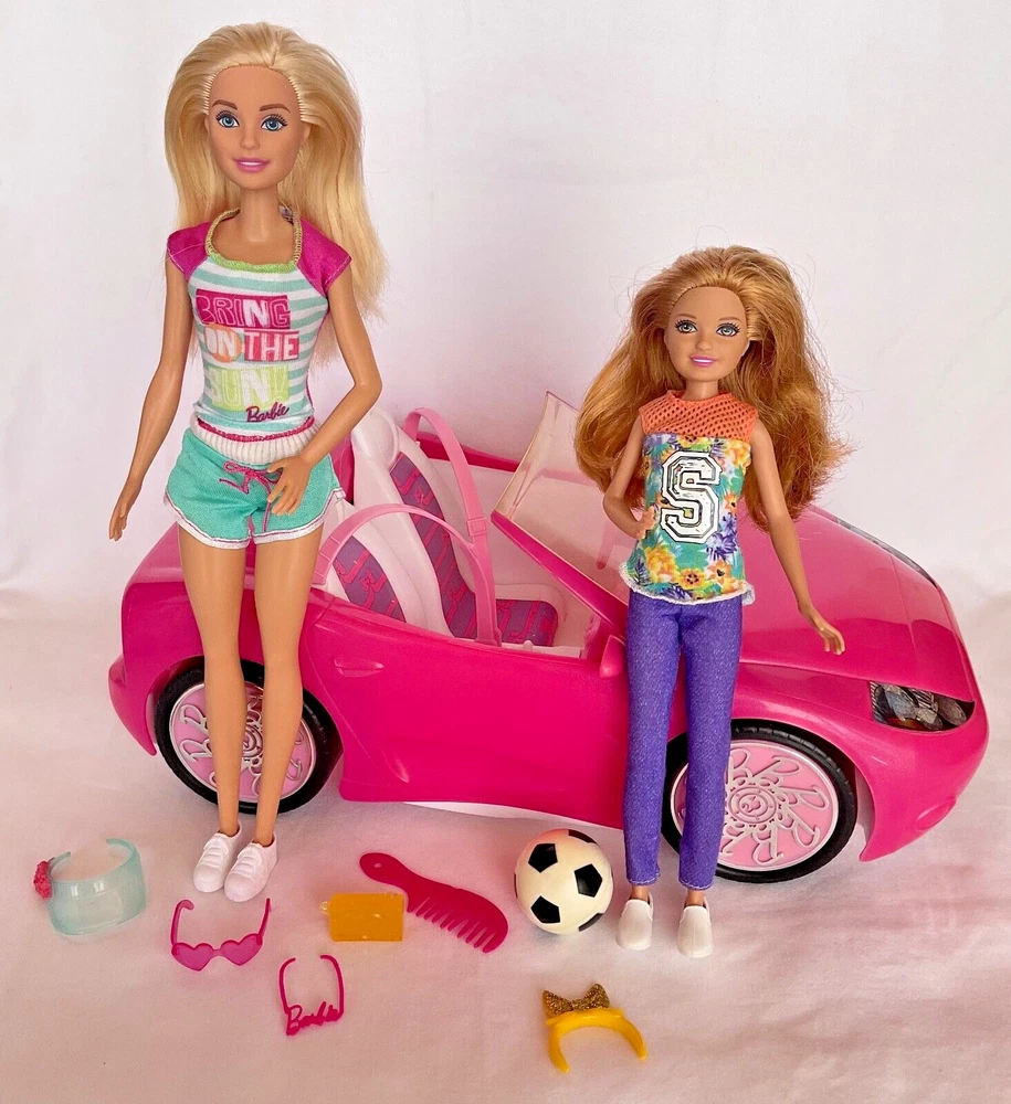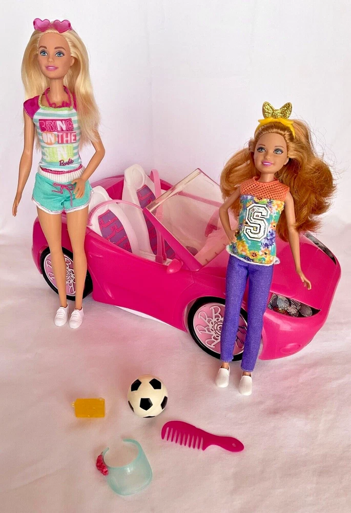 Get ready to hit the road with this amazing Barbie Glam Pink Convertible 2 Seater Sports Car! This bundle comes with Stacie and Barbie dolls as well as all the accessories they need for a fun day out. The car is made of durable plastic and has a pink color that will definitely turn heads. Whether you're a Barbie collector or just looking for a fun toy for your child, this bundle is perfect for you. The car is suitable for kids aged 3 and up, and the dolls have a wide age range of appeal. With its original design and high-quality materials, this bundle is a must-have for any Barbie fan. This custom bundle includes all items as shown in photos. Stacie doll comes with soccer ball, sparkly headband, tennis shoes, pants and top. Barbie doll comes with camera, sunglasses, Barbie necklace, sun visor, hair comb, tennis shoes, shorts and top. Car includes seat belts as shown. All items in this bundle are Barbie brand merchandise manufactured by Mattel.