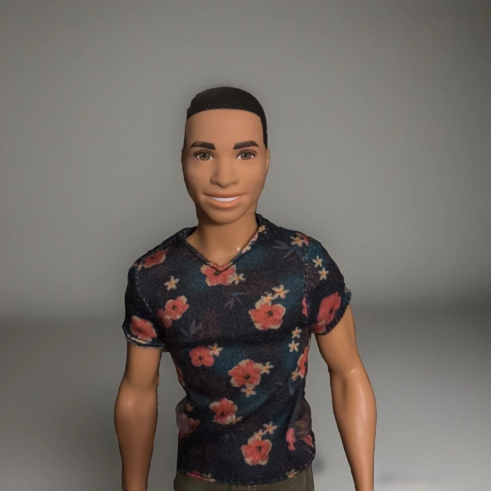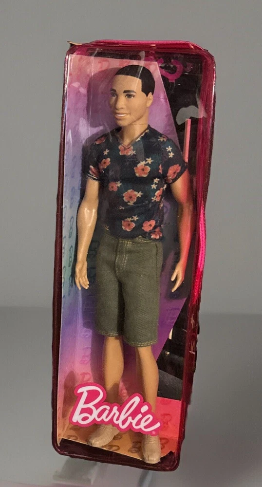 Barbie Fashionista Doll #4 Floral T Shirt, green shorts and tan shoes. Doll has been secured to new cardboard backing and repackaged in an authentic Barbie Plastic Case. Doll had never been played with. Original packaging too damaged for resale.