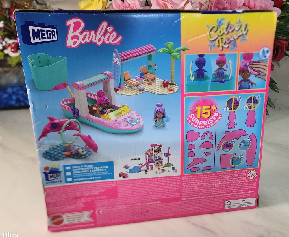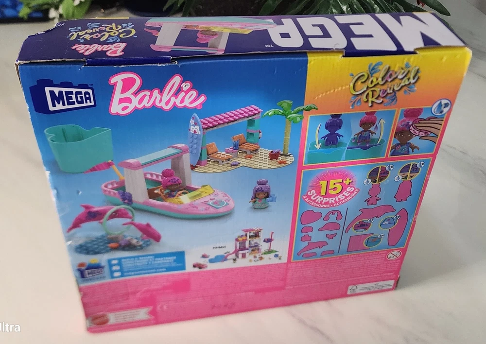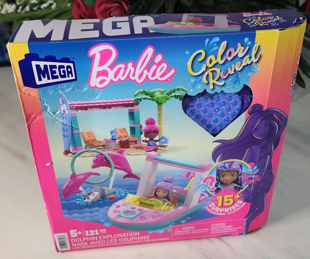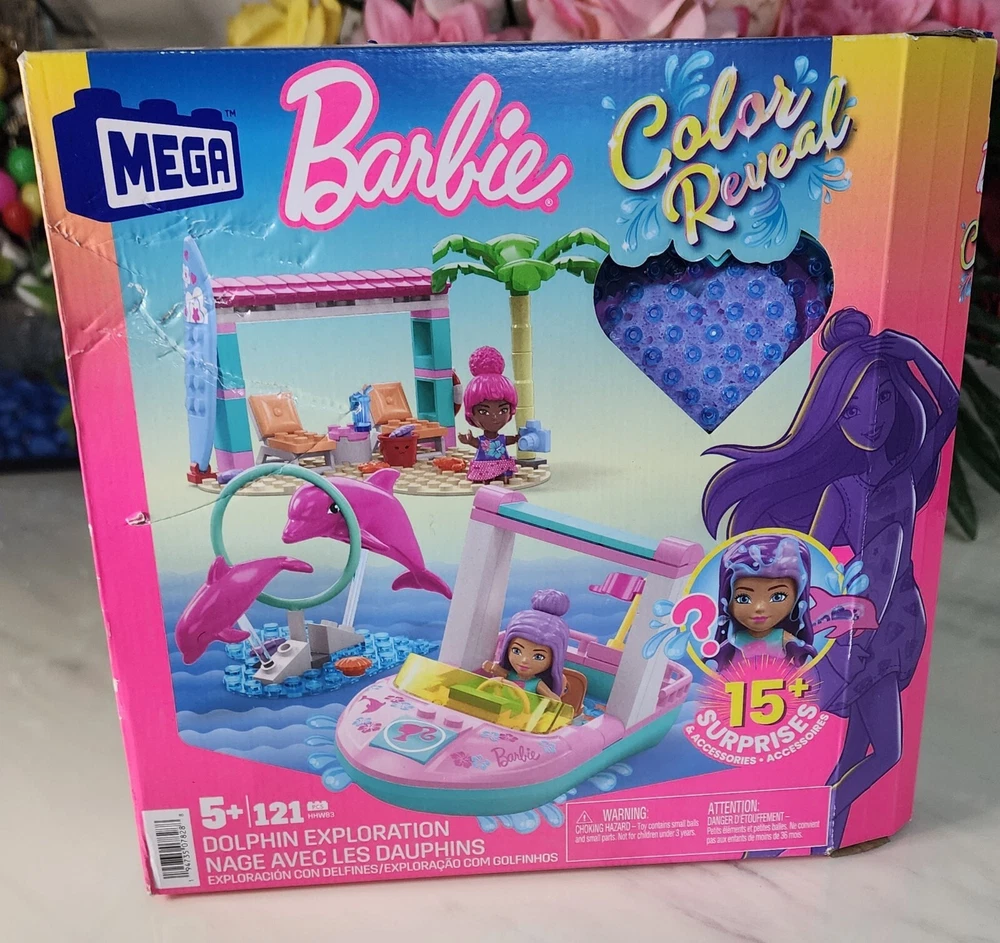 MEGA Barbie Color Reveal building toys deliver an unboxing experience that's full of surprises. Each micro-doll's look is a magical mystery waiting to be revealed. Start the reveal experience by opening the container and removing the baseplate to find 2 surprise bags. Inside you'll find 10+ surprise including 2 Color Reveal micro-doll. Fill the container with warm water, place the micro-doll inside and swirl her around to reveal her look. Then, dip the sponge in icy water to transform her appearance. Place the remaining mystery items in the warm water to reveal more surprises. Build the boat with a Color Reveal bottom to discover fish and place both micro-dolls inside to head out for the exploration. Then, build the jumping hoops to teach the dolphins new tricks. When it's time to relax, build the beach hut and have some fun in the sun. ●Building set comes with 2 Barbie Color Reveal micro-dolls, 2 dolphins, 114 bricks and special pieces including themed accessories, 1 heart-shaped container, and 2 heart-shaped building baseplates ●Discover 10+ surprises what will you reveal? Build the boat, dolphin jumping hoops and beach hut ●Bricks combine with all MEGA and Barbie buildings toys, and are compatible with other name brands ●Ideal for ages 4 and up, these building sets provide build-and-play and experiences to develop creativity and problem-solving skills Thank you for your order!