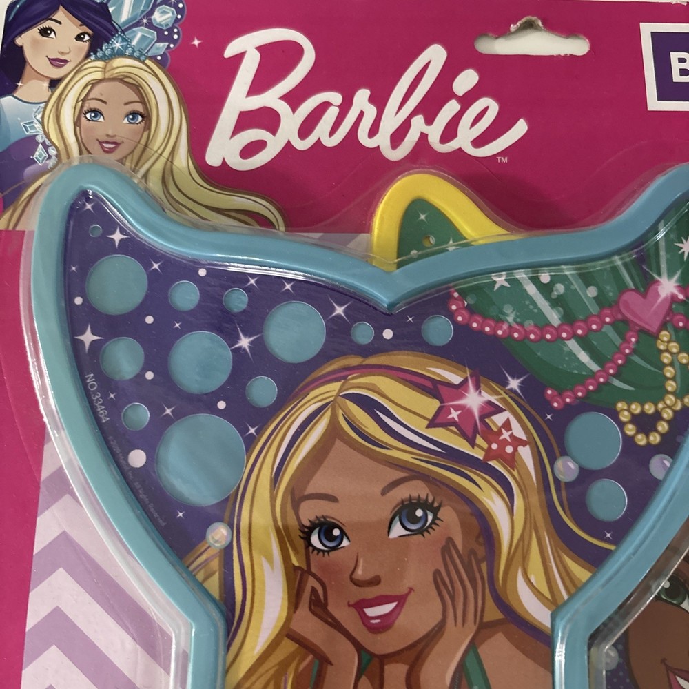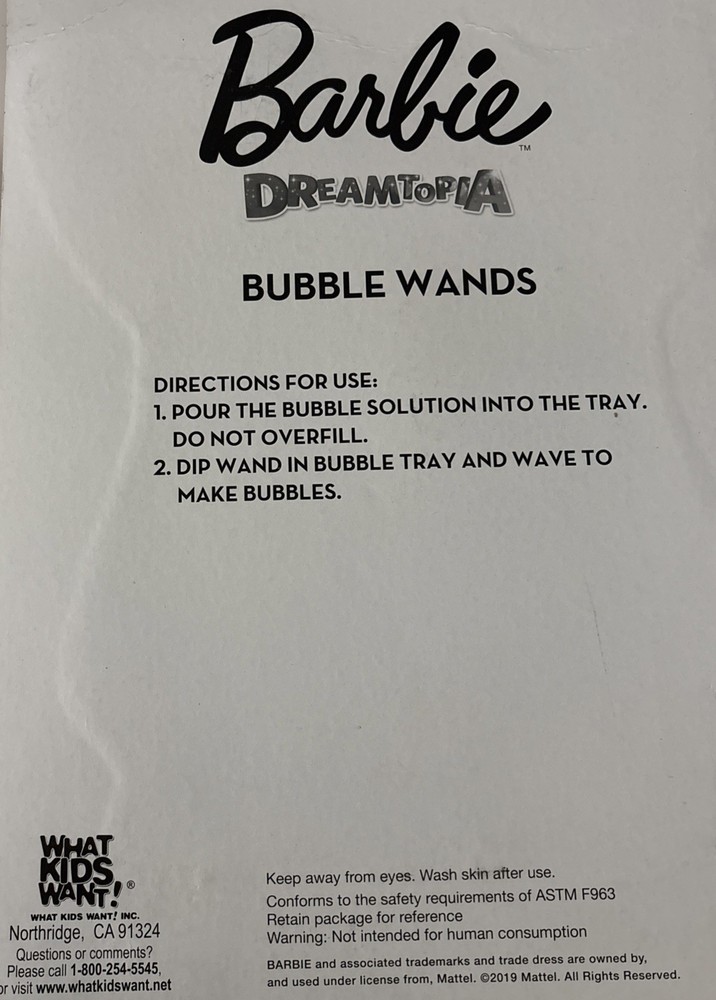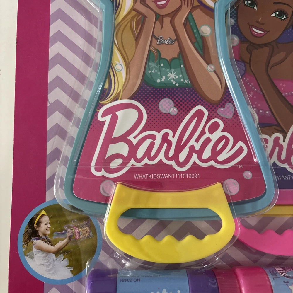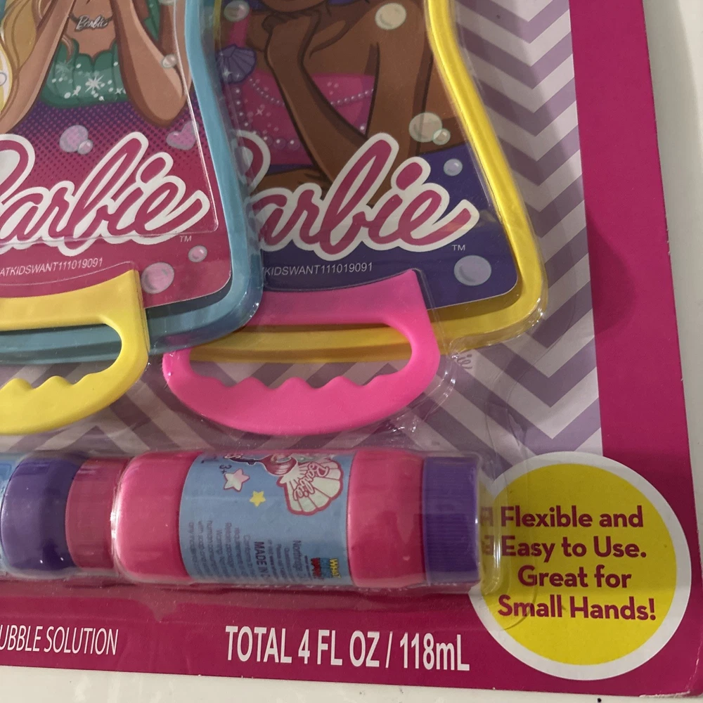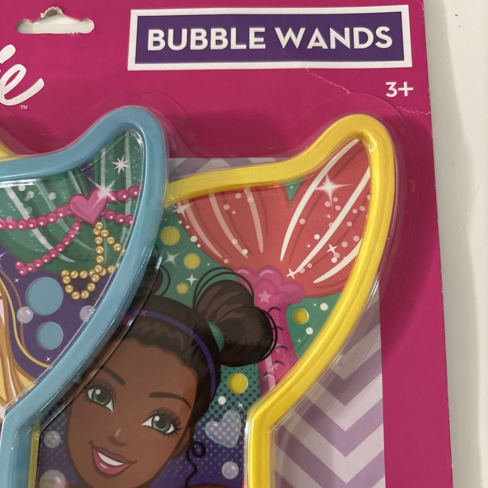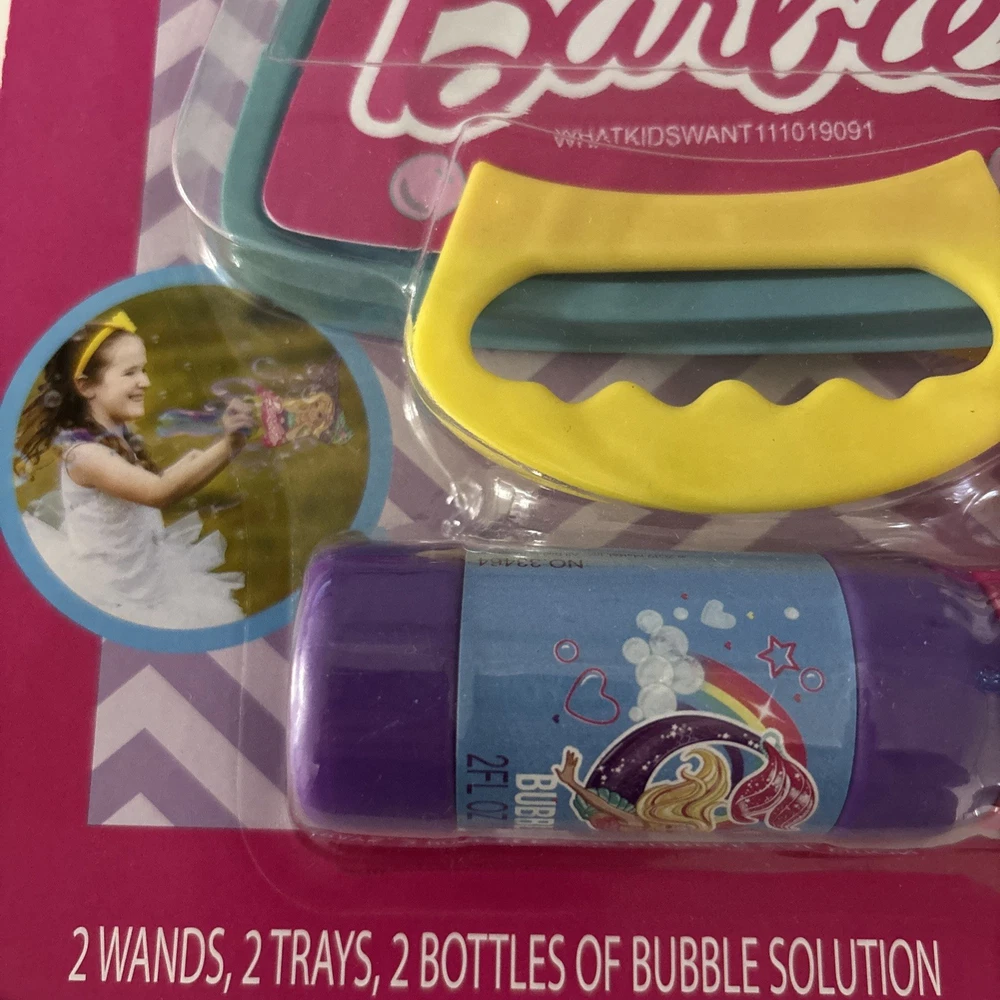 The NEW Barbie Bubble Wands Set includes 2 wands, 2 trays, and 2 bottles with a mermaid tail design. This toy set from the Barbie brand is recommended for children ages 3 and up. Made in China in 2019, this bubble toy set is perfect for outdoor play and creates a fun and colorful experience for young Barbie fans. With its whimsical mermaid tail design, this set adds a touch of magic to playtime.