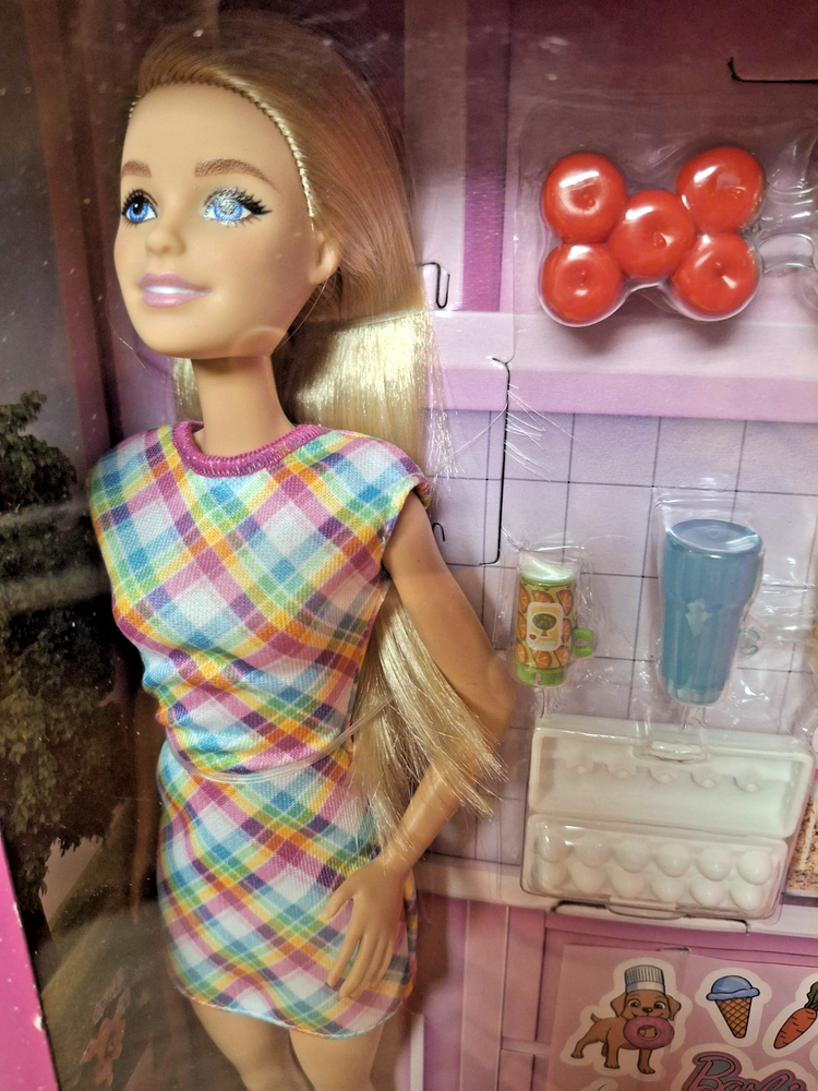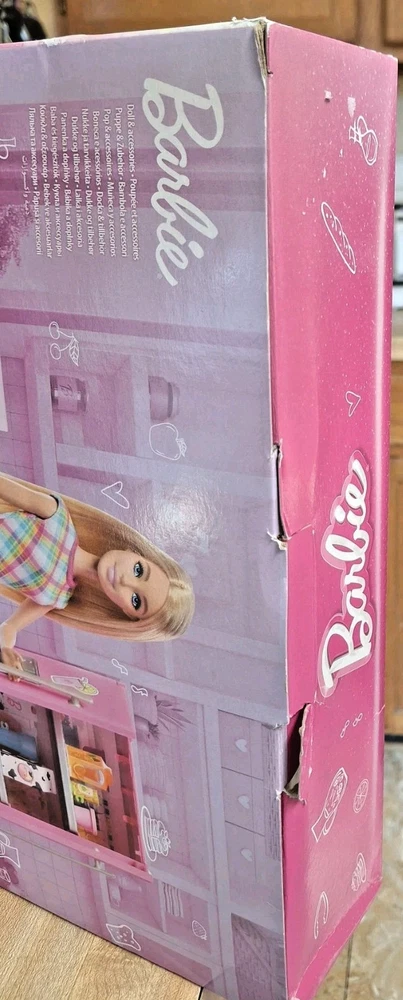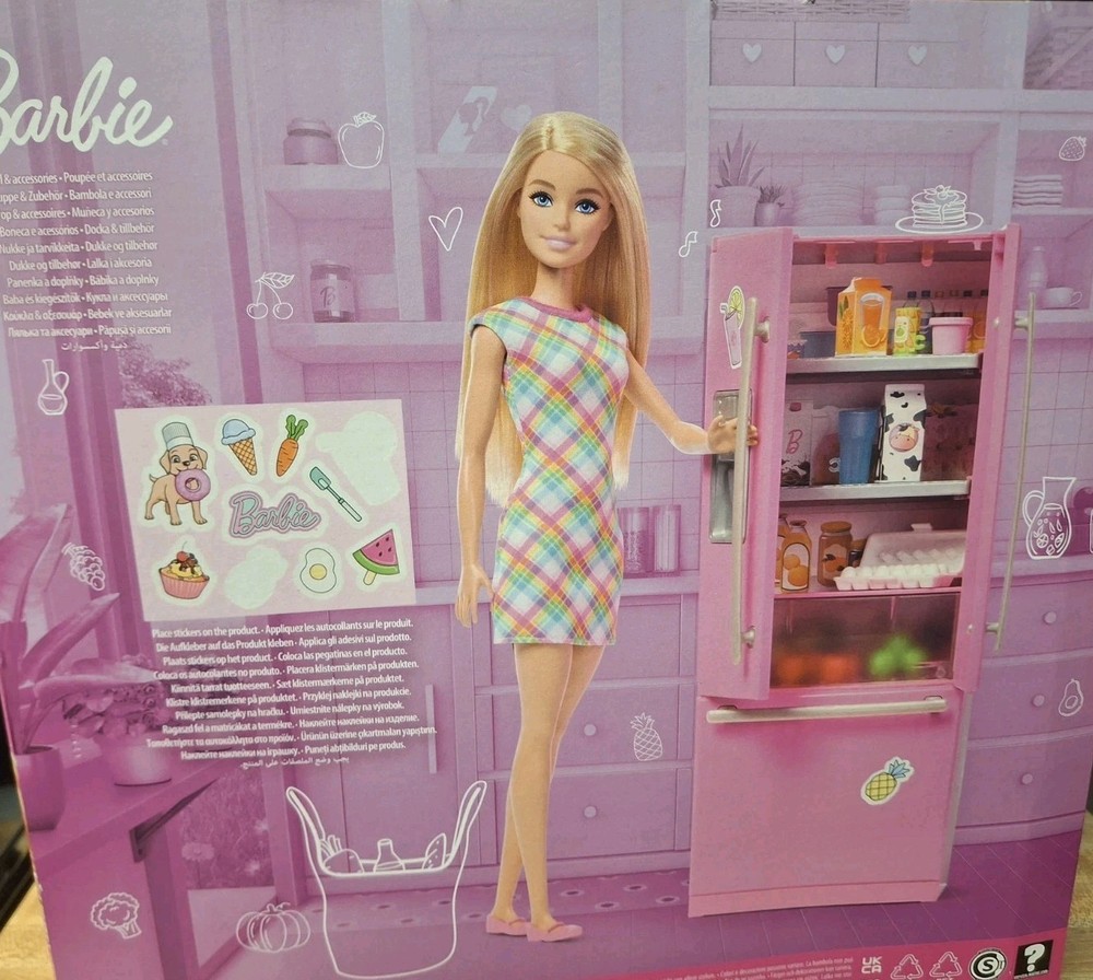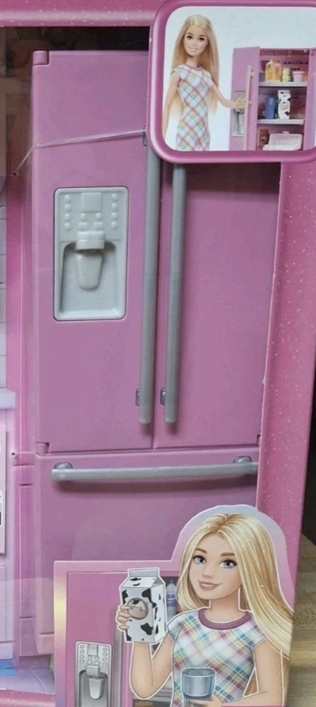 See photos. TEAR at top of box and DENT at bottom of box. Product never used. No items removed from box. This is bright pink Barbie doll refrigerator with double doors . The packaging artwork shows Barbie opening the fridge and holding a carton of milk. Inside the illustrated fridge are miniature food items and shelves for pretend play. The design has a modern look with silver handles and fun kitchen details, making it a colorful accessory for Barbie dollhouse or kitchen play.