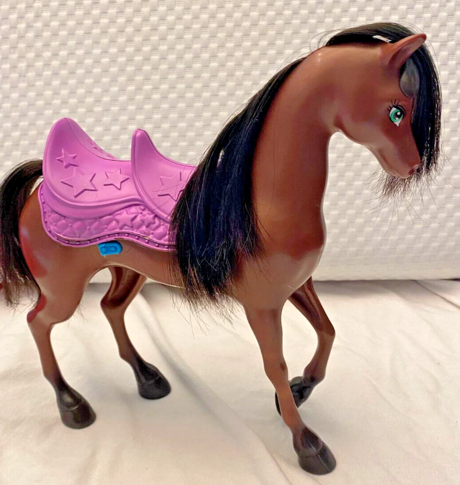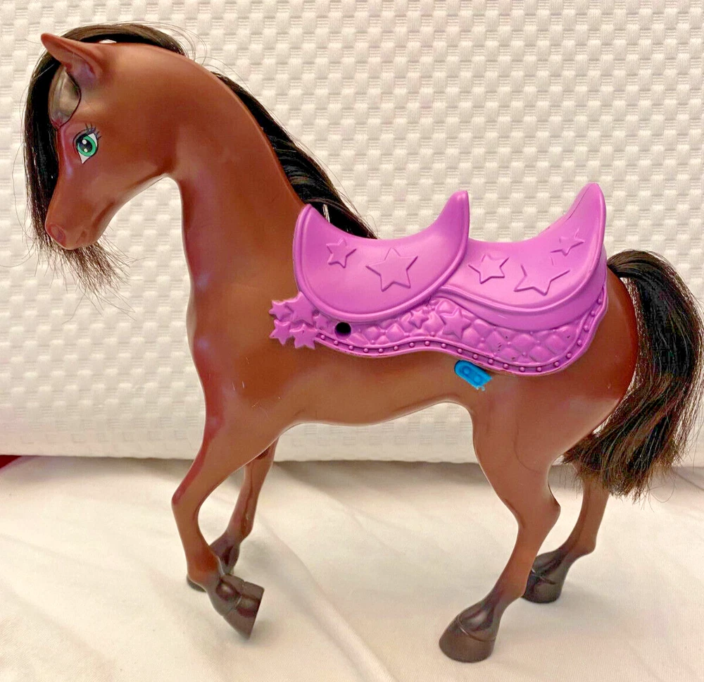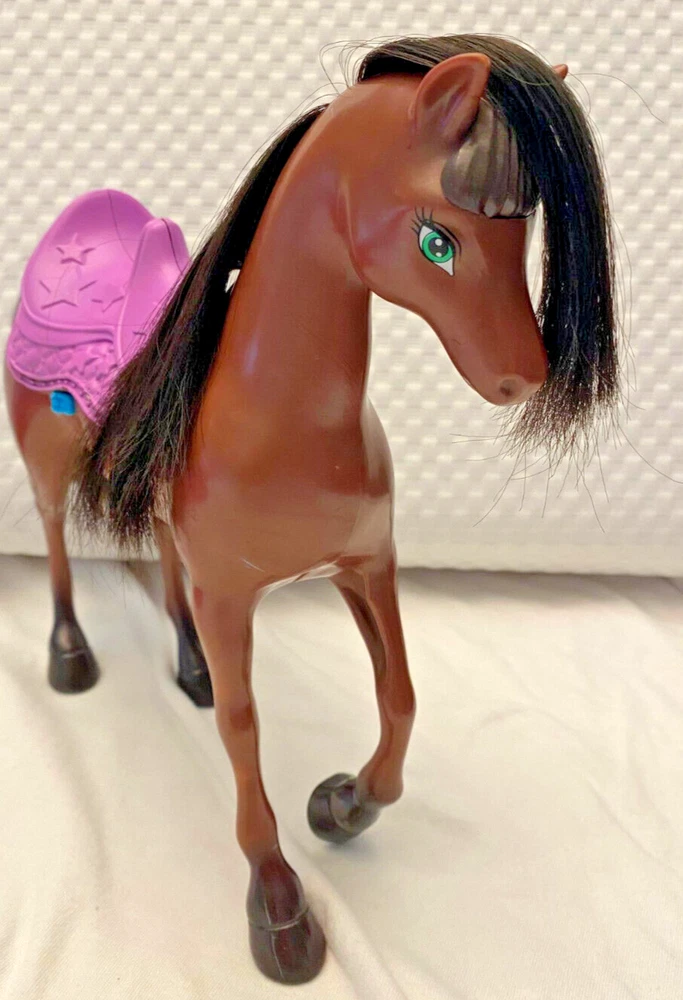 This Mattel 'A Pony's Tale' horse is a must-have for any Barbie collector. The purple Skipper Horse, made of vinyl, hard plastic, and rubber materials, comes with a saddle and fits 10"-4" dolls. This original licensed reproduction from 2012 is in great shape and ready for all occasions. The doll's brown eyes add a touch of realism to this imaginative toy. It weighs 10oz and is the perfect addition to any Barbie product line.