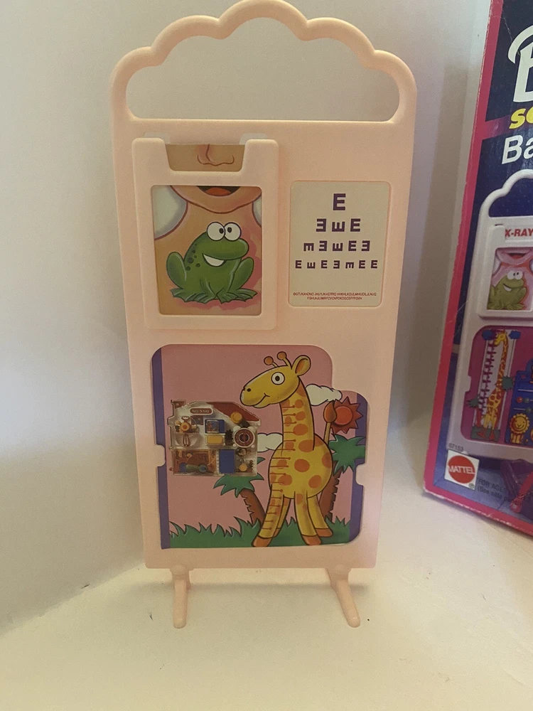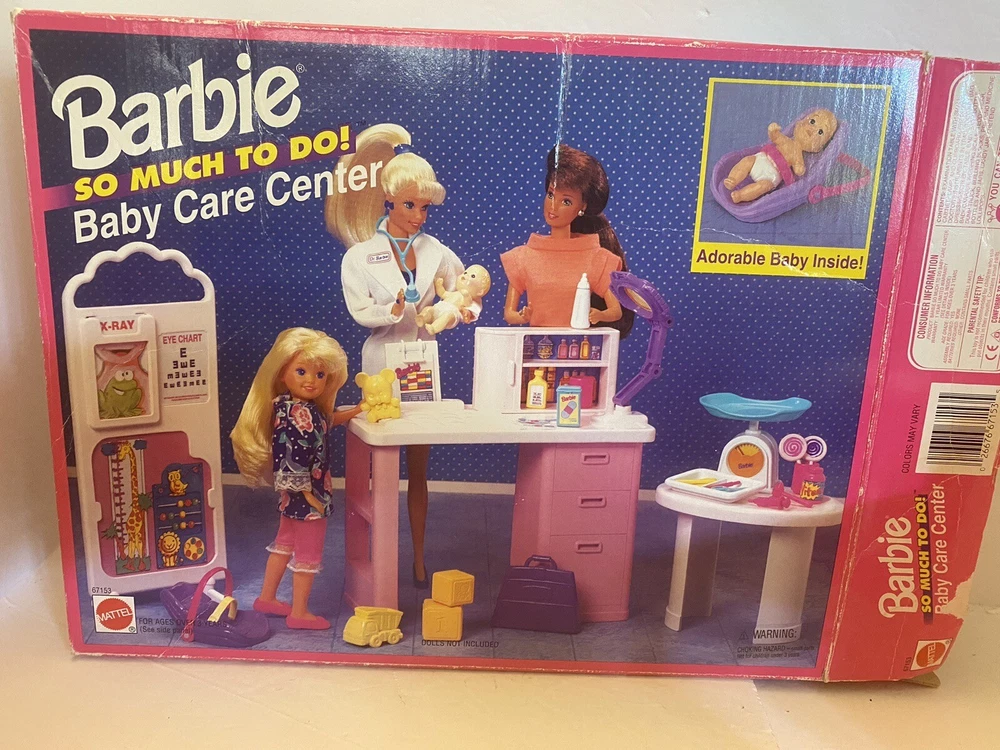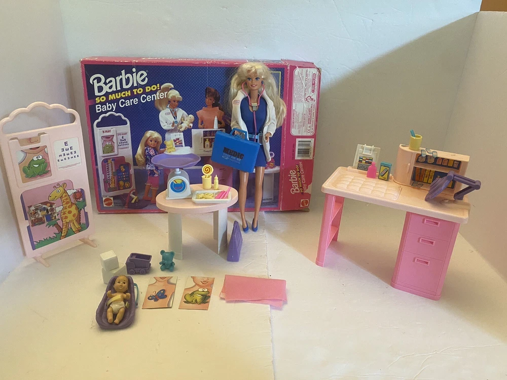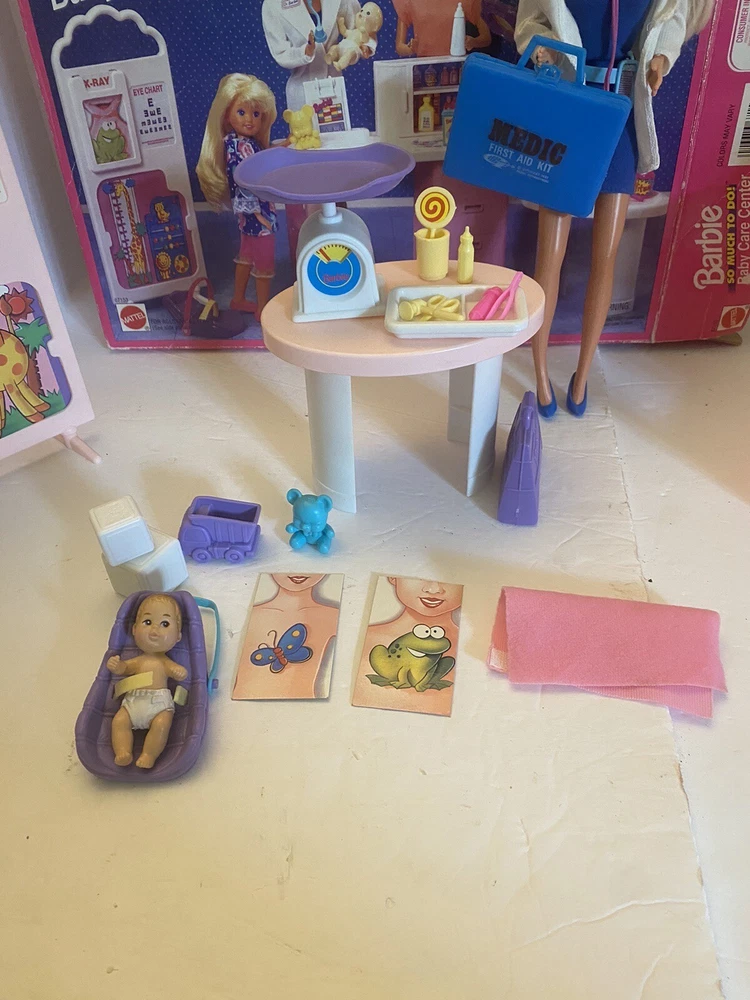 Mattel 1995 Baby Care Center Set. Comes with 1995 “Dr. Barbie” Doll and briefcase. Missing one lollipop and strap on the baby seat is broken (pictured) please let me know if you have any questions!