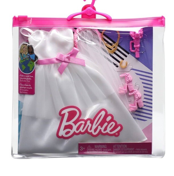Barbie Fashion pack Here comes the bride! Kids can dress their Barbie doll for a beautiful wedding with this Barbie fashion pack that features a complete bridal look and accessories. (Doll not included.) The satiny wedding dress is accented by a pink ribbon and sheer overlay at the waist. The veil floats down Barbie doll’s back and fastens to her head with a pink headband. Accessorize with elegant styling pieces: a golden necklace and bracelet, pink bouquet and strappy pink heels. Ken Fashion pack The groom will look the part in a dashing two-piece tuxedo accented by satiny lapels, a pink brooch and pink bowtie. Classic black shoes add a polished touch! Accessories include a ring box, golden watch, and sunglasses. The clothing set even comes with a pet puppy to join in on the ceremony! To enhance storytelling kids can also collect the Ken doll wedding fashion pack, which features a tuxedo and accessories for a groom on his big day. (Sold separately, subject to availability.)
