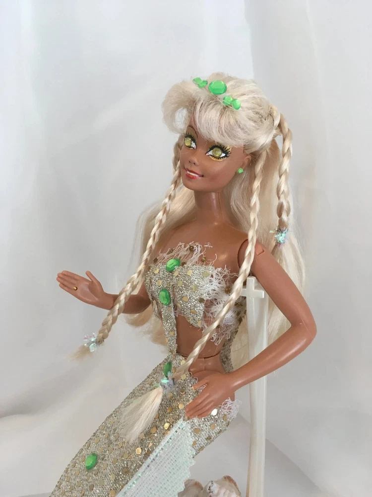 12" tall Mermaid Barbie Signed & Numbered; One of A Kind Doll is circa 1990's A siren of the deep, she has a new face, styled hair along with tail and fins. Jeweled eyes Take a close look at all the detail. Face repaint, hair restyle, total redress with matching stand. Jointed at neck, shoulders, waist and hips. Stand included. This is not a toy * Clothes are permanently attached. Look close; ask questions Shipping is FREE Thank you