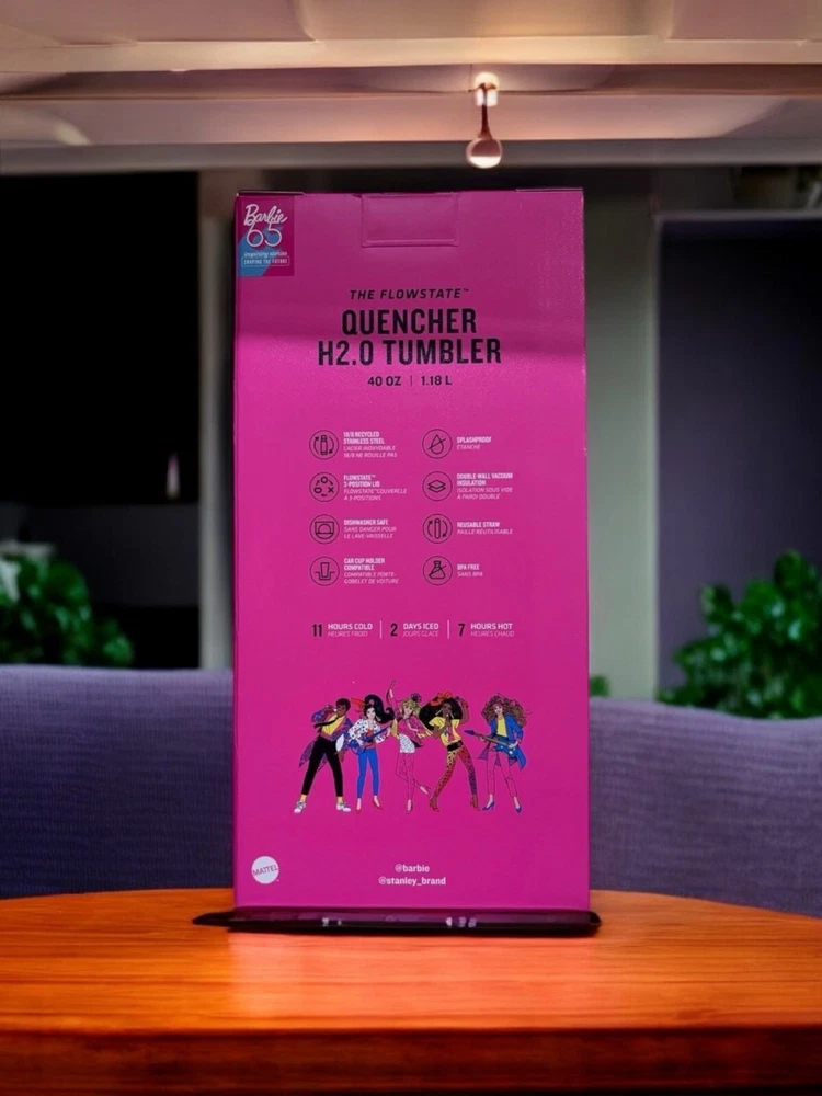 This Barbie x Stanley tumbler is the perfect addition to any collection. With a capacity of 40 ounces, it's perfect for keeping your hot or cold beverages at the right temperature. The tumbler features a drink-through lid, making it easy to sip on your favorite drink. It's made of stainless steel, plastic, steel, and BPA-free plastic, ensuring that it's durable and safe to use. The tumbler also comes with a handle and a straw, making it easy to carry around and enjoy on-the-go. Additionally, it's break/chip-resistant, recycled, and suitable for hot beverages. This tumbler is perfect for anyone who loves Barbie, travel, or just wants a stylish and functional drinkware option.