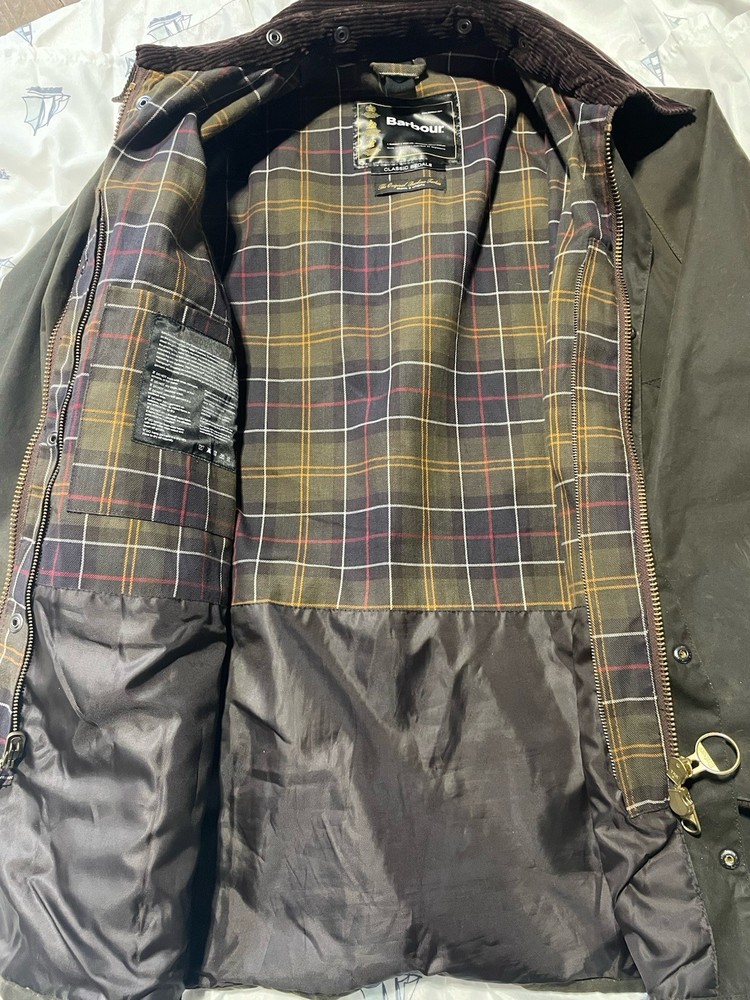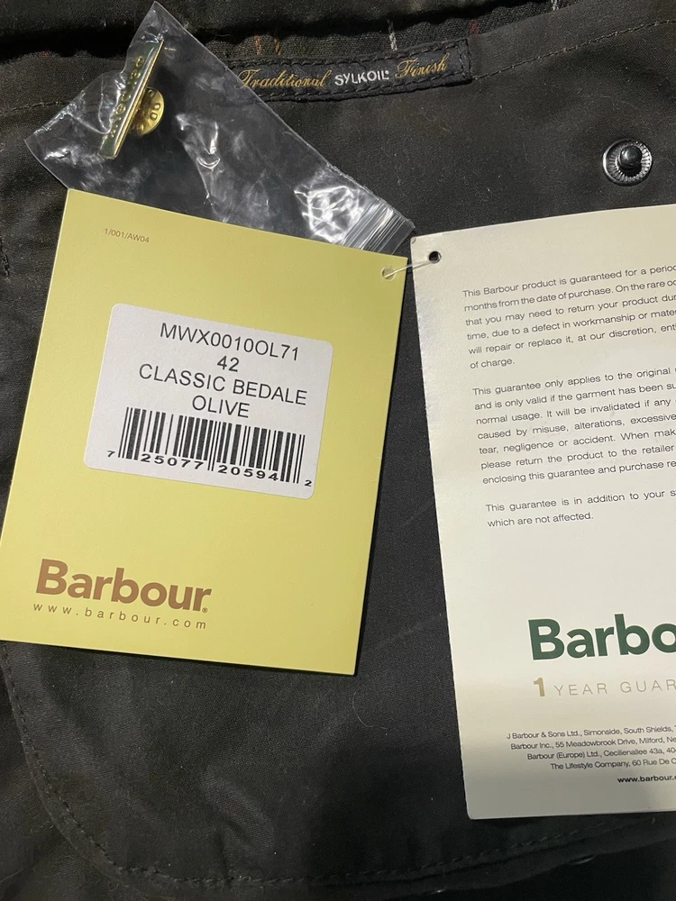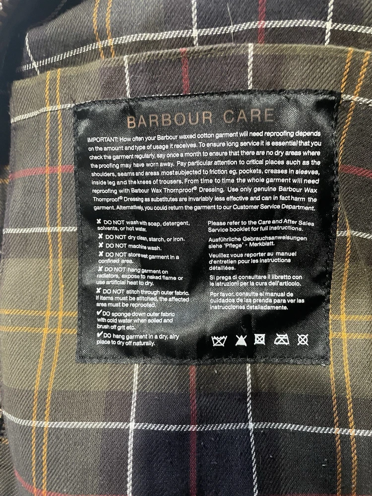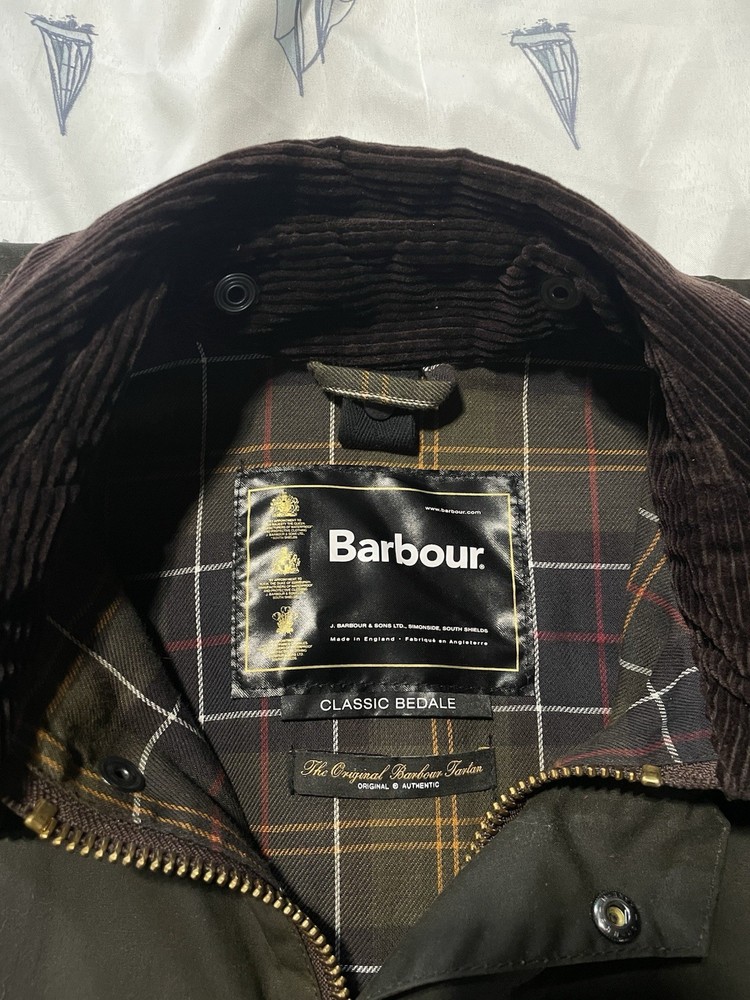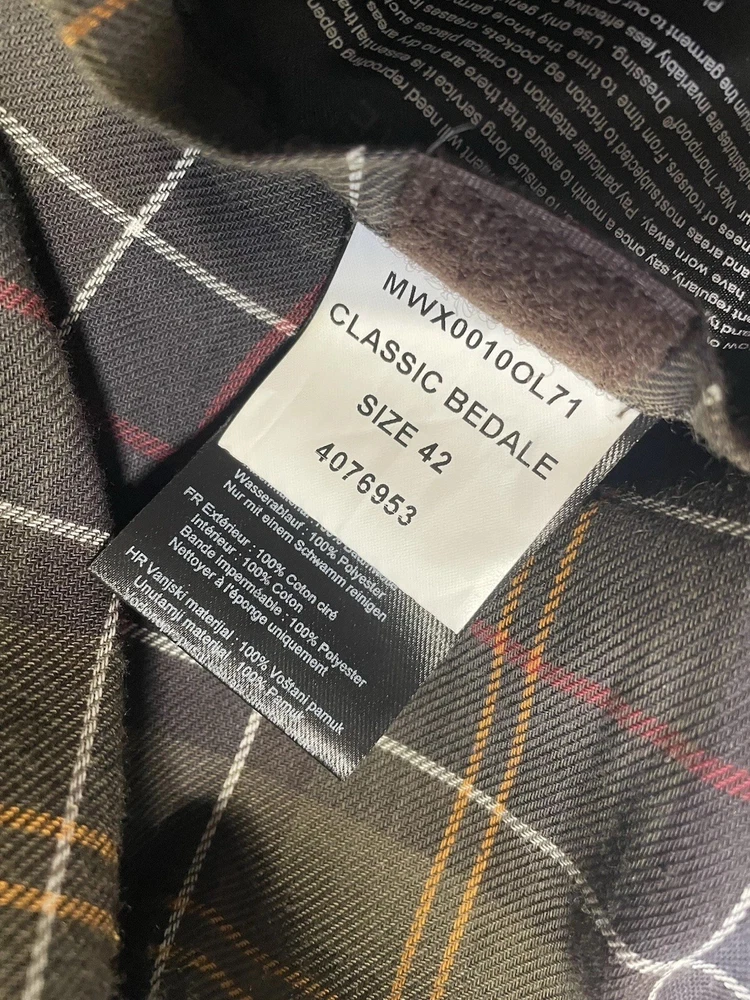 Classic Barbour Bedale Waxed Jacket in Olive NEW • Olive colored waxed outer lining, cotton plaid inner lining • Brand new with tags, Barbour pin included • Size 42 men’s, size XL Women’s • Zip & snap closure • From a smoke free, pet free home The Barbour Classic Bedale Waxed Jacket in Olive is a versatile and stylish mid-length jacket designed for men in size 42. Made from durable cotton with a waxed finish, this jacket is perfect for casual occasions and features a zip closure, button accents, and the Barbour logo. With its classic design and high-quality construction, this jacket is a must-have for the winter, fall, and spring seasons, offering both warmth and protection from the elements. Proudly made in the United Kingdom, this Barbour Bedale jacket is a timeless and practical addition to any wardrobe.