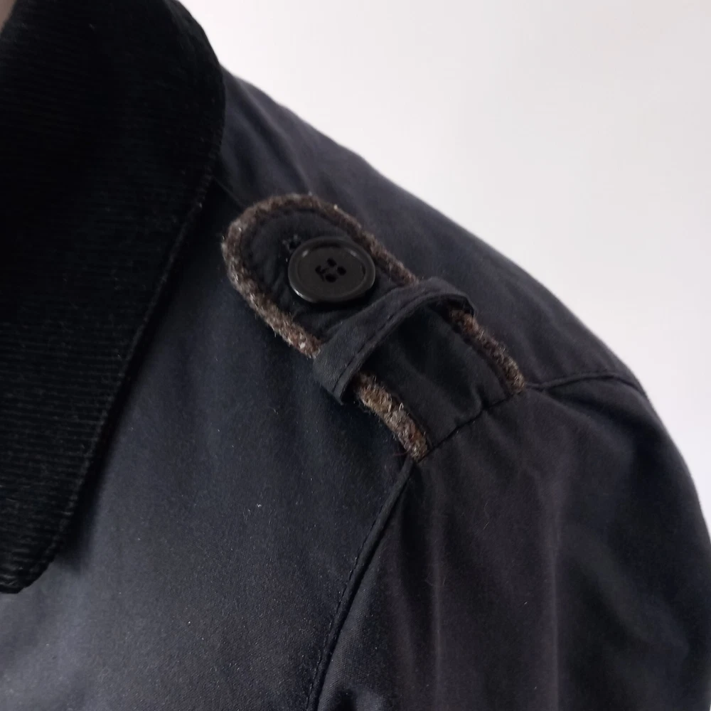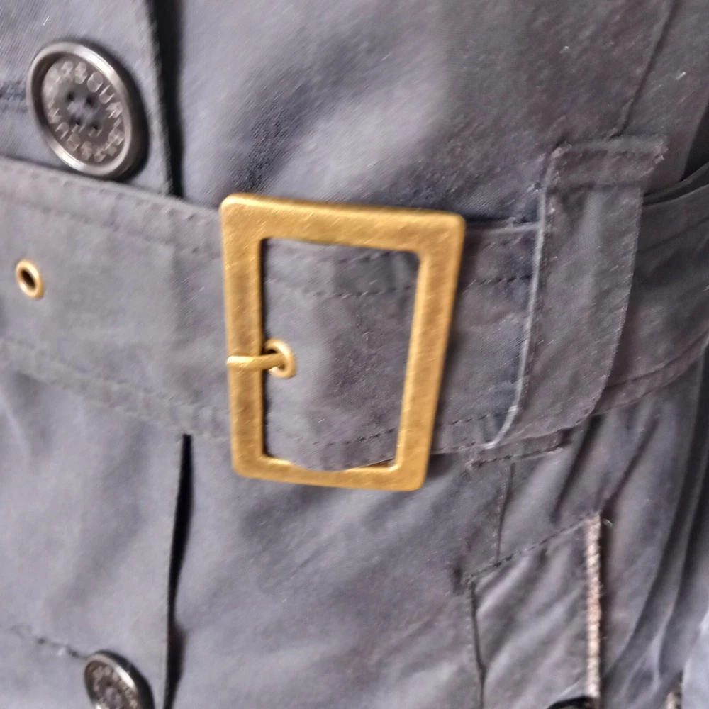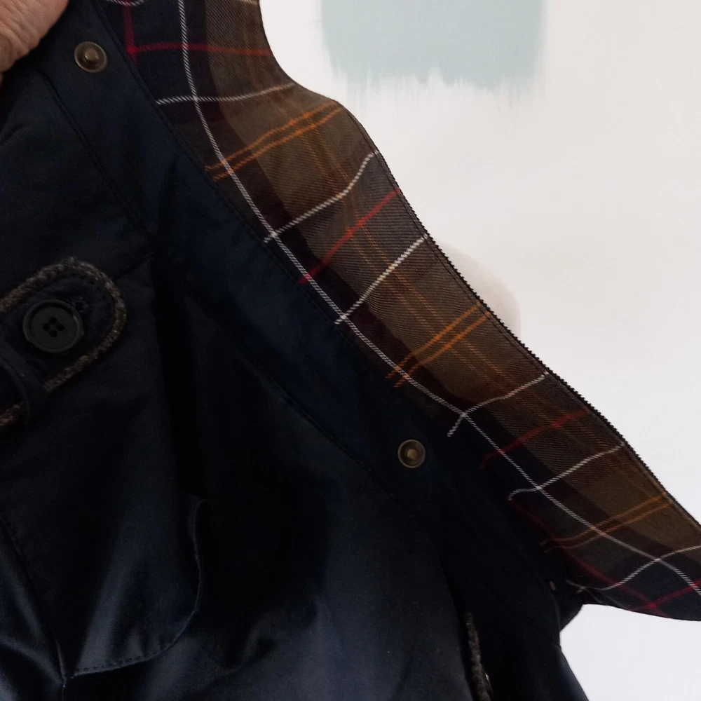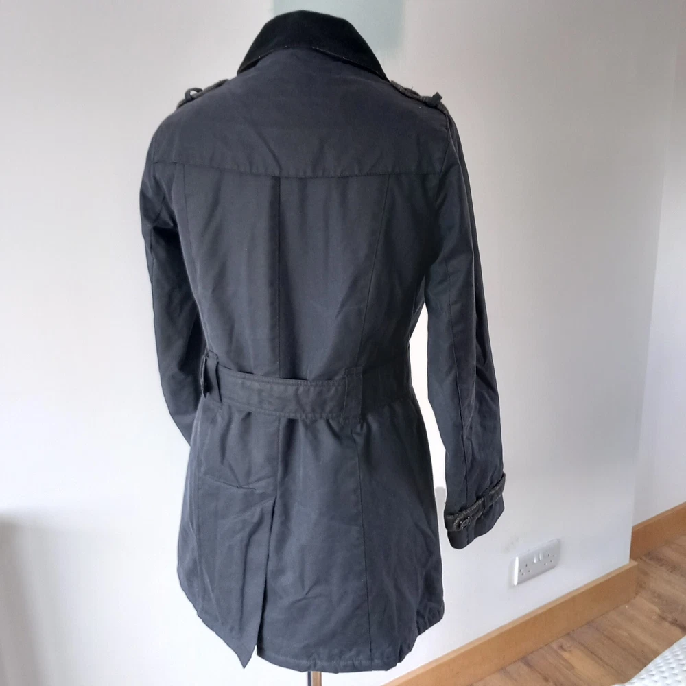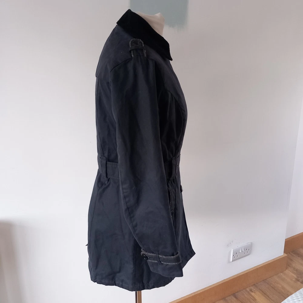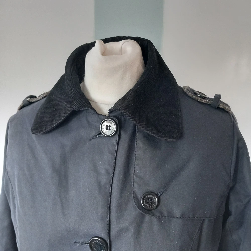 Barbour ‘Dalmeny Trench’ Waxed Jacket Women’s size UK 12 Blue waxed cotton outer Quilted cotton lining Belted waist Button closure Approximate Measurements A) Shoulders - 15" B) Pit to pit - 20” C) Nape to hem - 31” D) Pit to cuff - 18.5” E) Shoulder to cuff - 24"