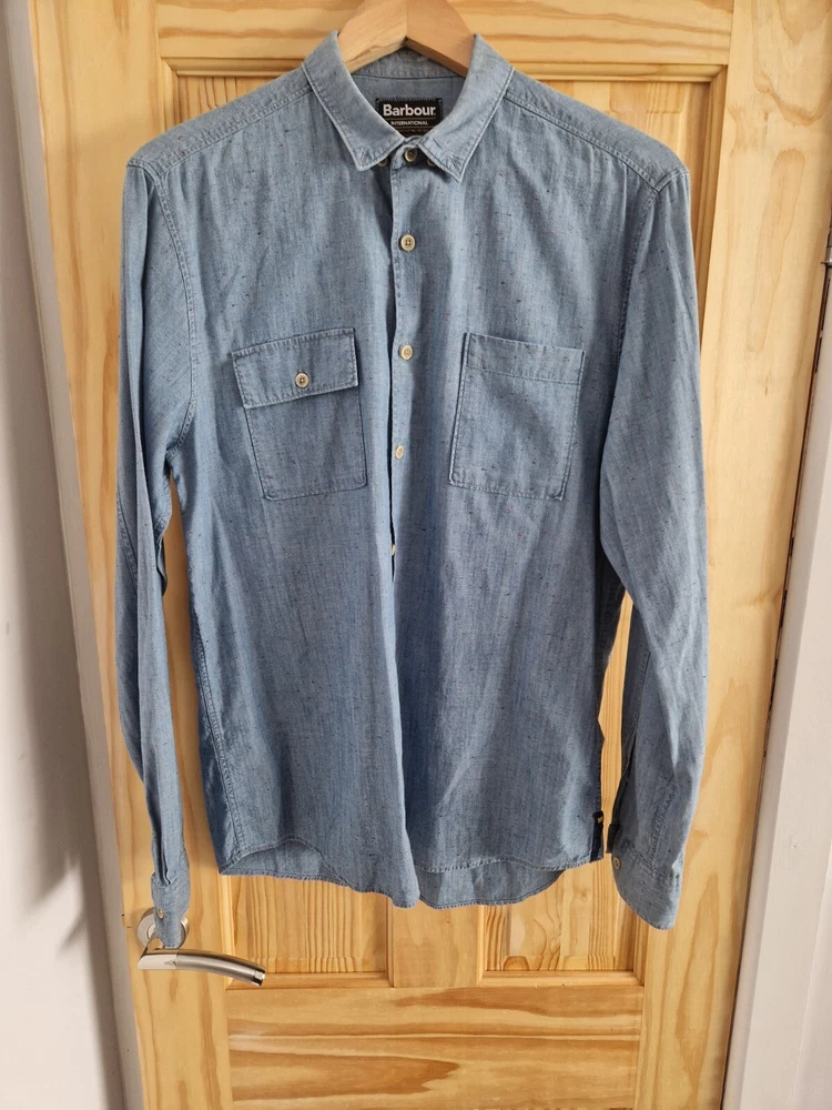 Pit to pit - 20 inches Length - 26 inches Crafted for the style-conscious individual, the Barbour International Denim Casual Shirt is a versatile addition to any wardrobe. The medium size ensures a slim fit, while the long sleeves and collared neckline offer a classic silhouette perfect for any casual occasion. Its solid medium blue hue is easy to pair with a variety of bottoms, making it a go-to choice for those who appreciate simplicity and quality. The shirt is made from a breathable cotton blend, which provides comfort across all seasons. Embroidered accents and button details add a touch of sophistication to this machine washable piece. Whether you're out for a casual meet-up or enjoying a laid-back day, this Barbour denim shirt will keep you looking effortlessly put together.