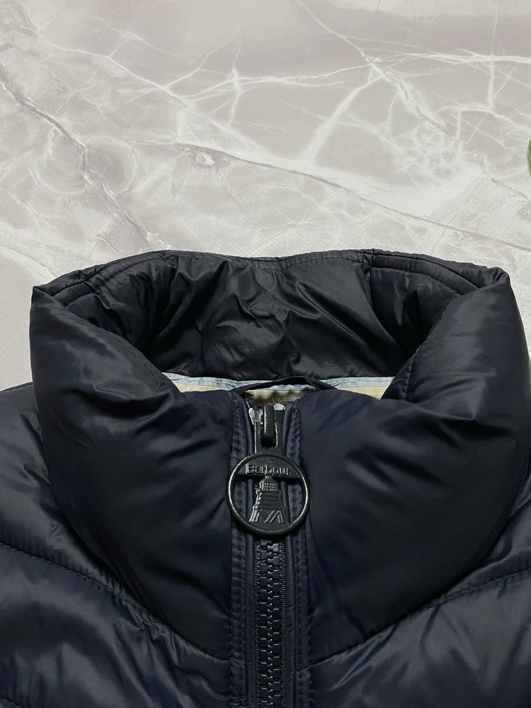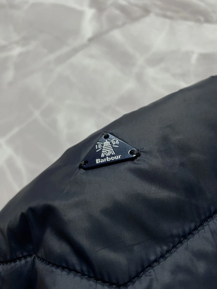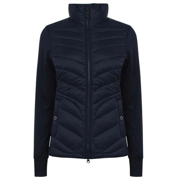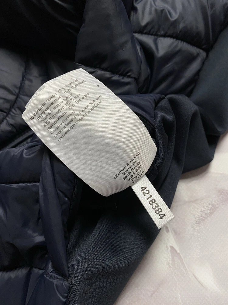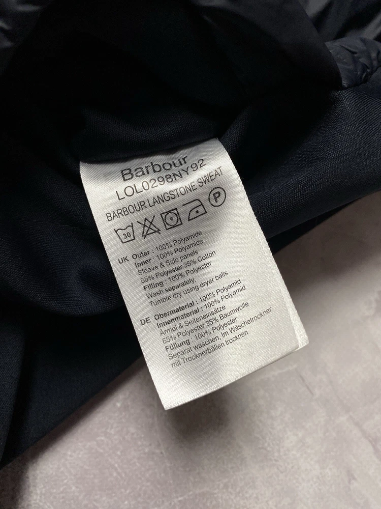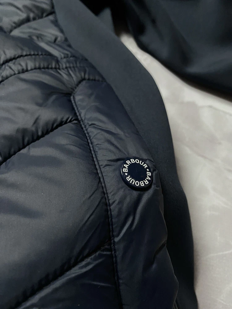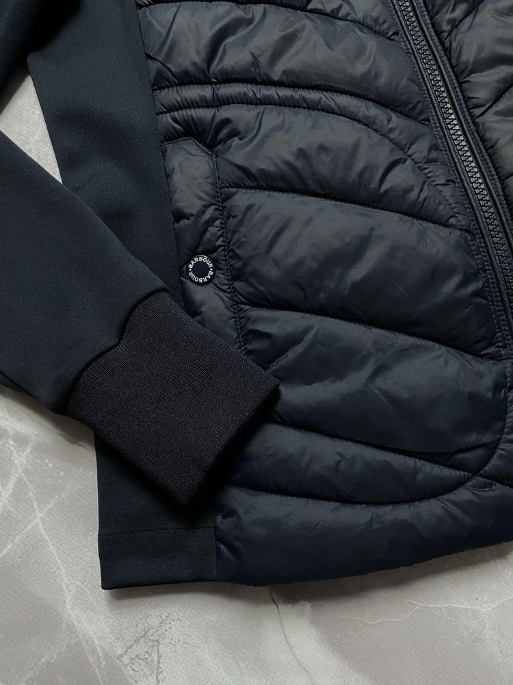 Barbour Langstone Sweat women's hybrid jacket in navy blue color with branded metal logo at the back Outer material and lining of the torso 100% nylon, Insulation 100% Fiberdown polyester Sleeves and side panels made of a combination material 65% polyester 35% cotton Double YKK zipper, 2 pockets with buttons on the front CONDITION Excellent, without defects SIZE UK 10 MEASUREMENTS: Shoulders - 37 cm Sleeve (from the shoulder) - 62 cm Width (underarms) - 48 cm stretches to 52 cm Width (at the waist) - 45 cm Length (from the neck) - 64 cm