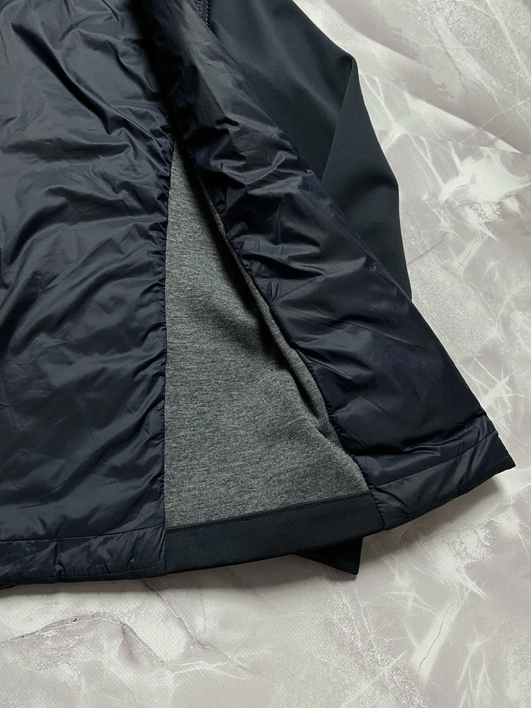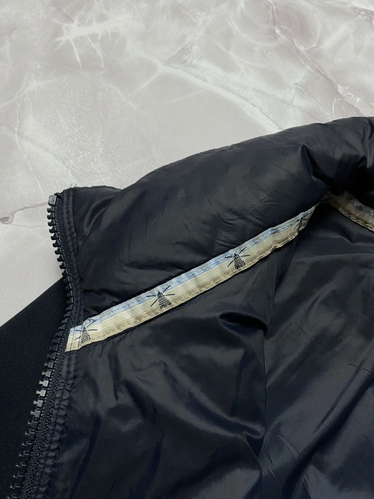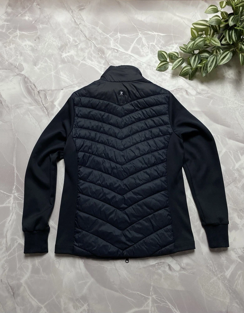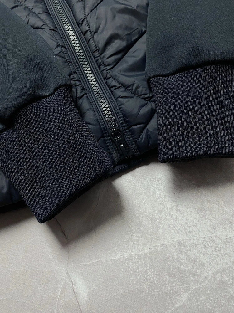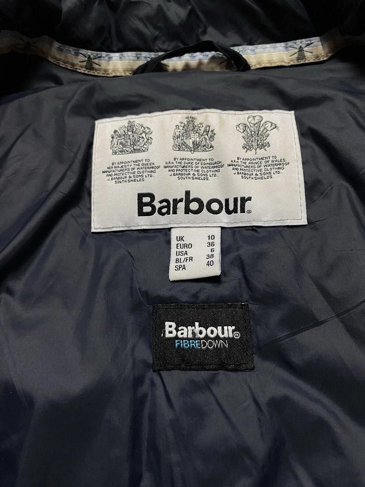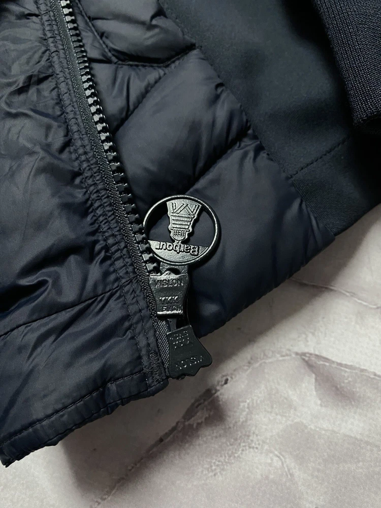 Barbour Langstone Sweat women's hybrid jacket in navy blue color with branded metal logo at the back Outer material and lining of the torso 100% nylon, Insulation 100% Fiberdown polyester Sleeves and side panels made of a combination material 65% polyester 35% cotton Double YKK zipper, 2 pockets with buttons on the front CONDITION Excellent, without defects SIZE UK 10 MEASUREMENTS: Shoulders - 37 cm Sleeve (from the shoulder) - 62 cm Width (underarms) - 48 cm stretches to 52 cm Width (at the waist) - 45 cm Length (from the neck) - 64 cm