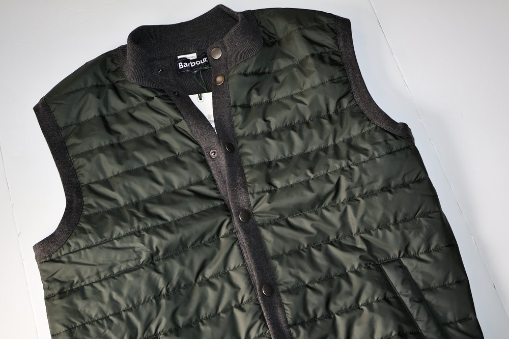 Item: Men's Vest Manufacturer: Barbour Condition: Size: Large L UK Sizing Line: MKN0920CH91 Material: Polyamide Cotton Blend Retail Cost: $160.00 Color: Front is GREEN Back is Charcoal Grey Measures: 22 inches across the back Pit to Pit PLEASE compare your size to this BEFORE you buy! NO two Barbour jackets fit alike. We use one set of pictures to represent all the sizes we have in a style. You will get the size listed in the listing not the size of the vest in the picture. Verify your size before buying 22 inches across back pit to pit This is cut slimmer then a U.S Extra Large!