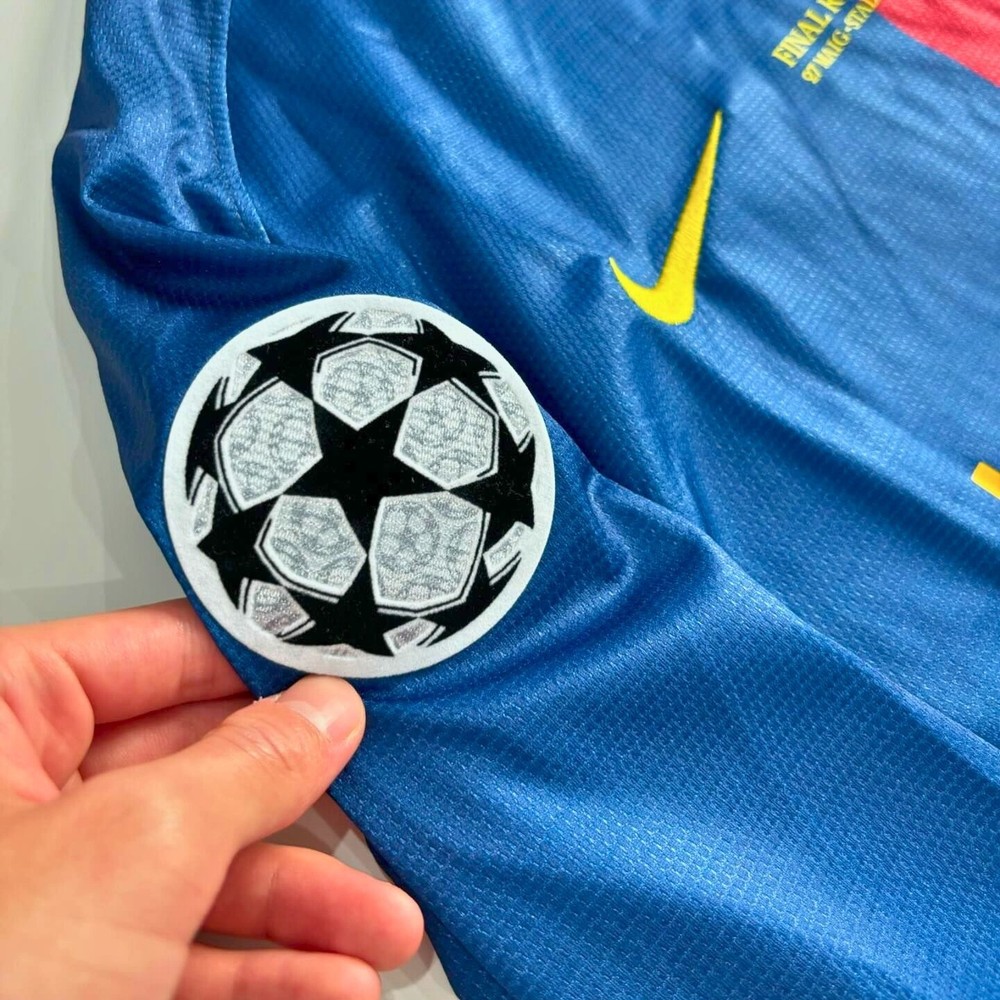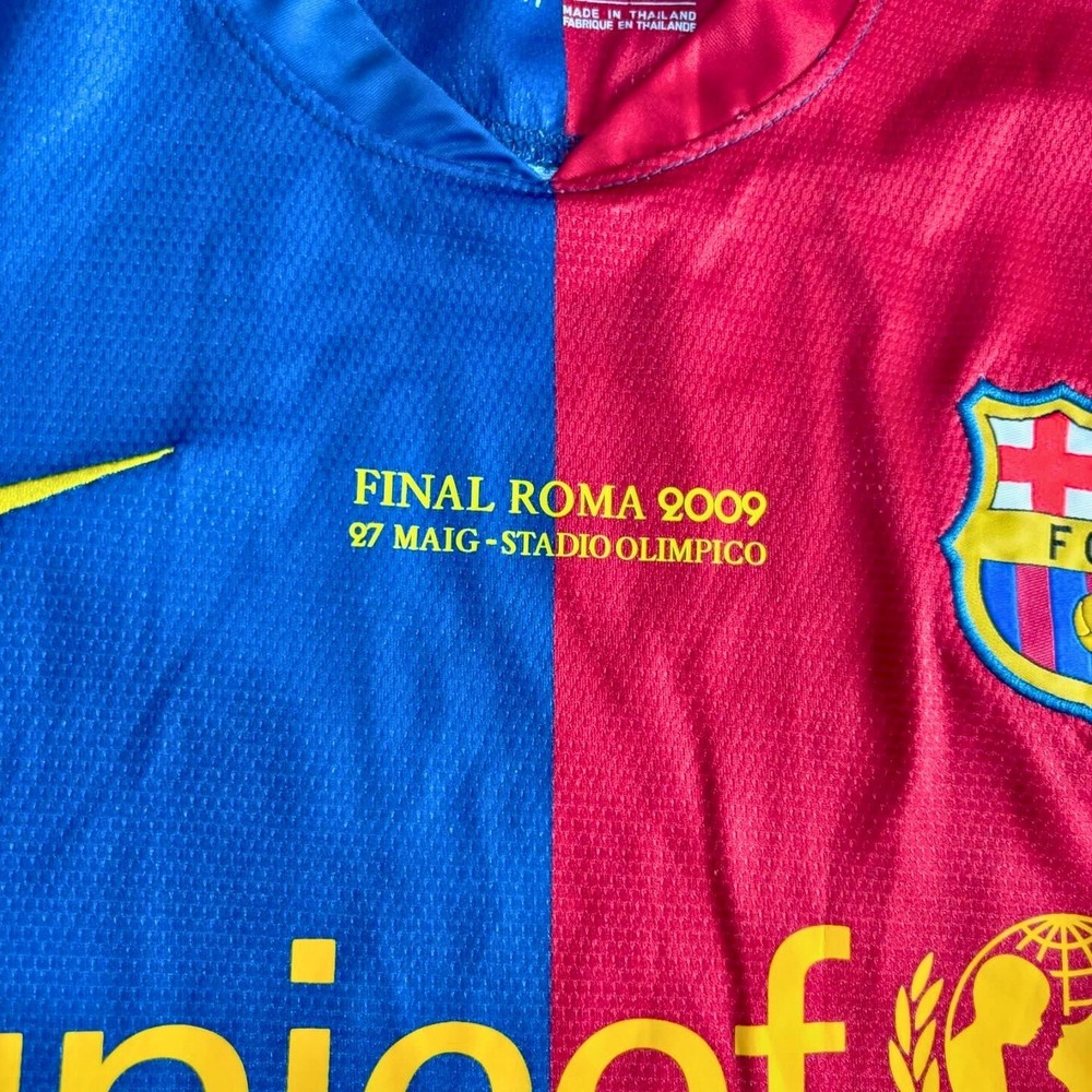 About: Relive the glory of the historic 2008-2009 treble-winning season with this iconic FC Barcelona home jersey. This rare long-sleeve edition commemorates the 2009 Champions League Final in Rome, featuring the detailed match-day embroidery on the chest. Adorned with the legendary Messi #10 on the back, this piece captures the moment the world's greatest player secured the trophy with his famous header in Italy. Designed with a classic blue and red half-and-half motif, the jersey includes the official Starball patch on the sleeve and the unicef sponsor across the front. Crafted from breathable, moisture-wicking performance fabric with professional-grade stitching, it offers both comfort and durability for fans and collectors alike. Whether you're looking for the perfect holiday gift for a soccer enthusiast or a standout addition to your sports memorabilia collection, this jersey is a timeless tribute to one of football's most dominant eras. A must-have for shoppers seeking high-quality fan apparel that evokes pure nostalgia. Details: Condition : Brand new with tags Style : Fan version Football shirt Details : Stitched team crest and logo / Player name and number are pressed Size : Unisex adults - Loose fit Shipping: Free shipping worldwide Processing within 2 business days Get it delivered within 5-10 Business days. Tax free: All taxes are covered, what you see at checkout is the final price you pay. Returns: We got you covered, Simply reach out to us within 30 days of delivery for a smooth solution. Take care of your jersey: Wash: Inside out, cold water (30°C max), and a delicate cycle. Detergent: Mild liquid only; no fabric softener or bleach. Dry: Air dry only on a hanger. Never use a dryer. Iron: Steamer only, or iron inside out on the lowest heat with a towel barrier. Storage: Hang it up to avoid creasing the logos/printing.