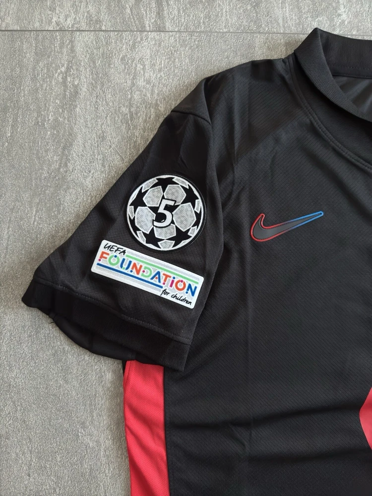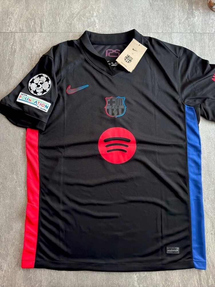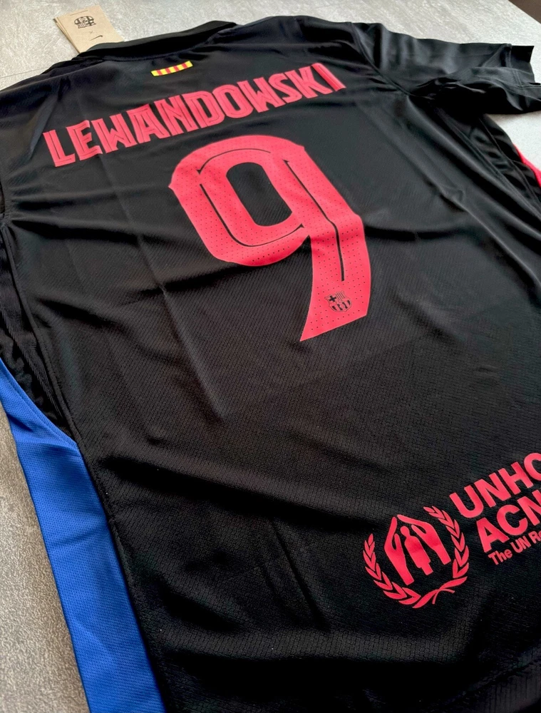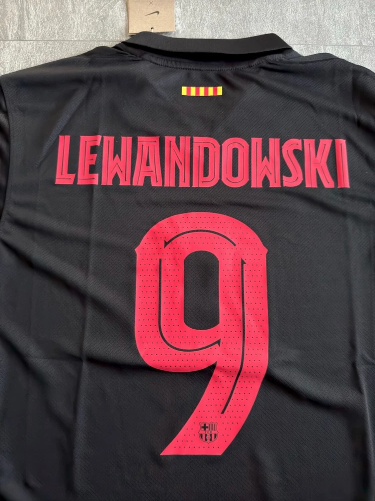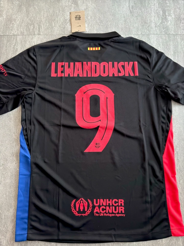 Show your support for FC Barcelona with this beautiful 24/25 Away jersey. Made with high quality materials, this jersey is perfect for any soccer fan. It features the team's iconic colors and logo, as well as your favorite player's ‘Lewandowski 9’ name and number. The jersey is available in size Medium and is perfect for anyone who wants to show their love for the team. Whether you're watching the game at home or cheering on the team at the stadium, this jersey is a must-have for any true fan. This is a REPLICA jersey. Replica does NOT mean FAKE. A replica jersey is a fan-friendly, officially licensed jersey that is inspired by the jerseys worn by professional athletes. Replica jerseys are designed for comfort and everyday wear
