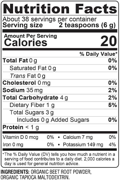 Dosage: Does not apply Brand: BareOrganics Number of Pills: Does not apply Department: Does not apply Features: Does not apply When to Take: Does not apply Flavor: Beet Item model number: 22240608 Main Purpose: Does not apply Active Ingredients: Does not apply UPC: 818423028613 Item Weight: Does not apply Country of Origin: USA Type: Does not apply gtin13: 818423028613 Ingredients: Does not apply California Prop 65 Warning: Does not apply Manufacturer: Diya Beauty and Wellness Country/Region of Manufacture: Does not apply Formulation: Does not apply Expiration Date: Does not apply Product Dimensions: 4.06 x 4.06 x 4.38 inches; 9.6 ounces Volume: Does not apply MPN: NA