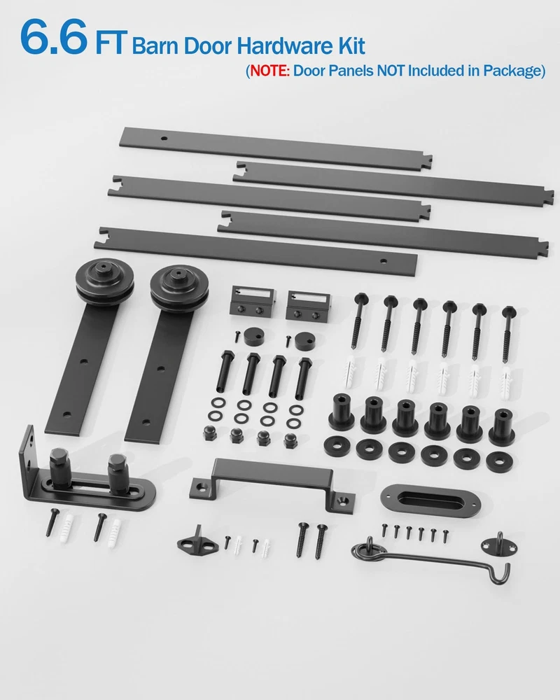 The Barn Door Hardware Kit is a popular choice for installing sliding barn doors in various spaces like kitchens, bedrooms, or garages. This sliding door hardware kit fits door panels 34" to 37" Width and 1-3/8" to 1-3/4" Thickness. Easy Installation Comes with mounting hardware and instructions. Package Includes: 5x Rail (combine to 6.6ft), 1x Adjustable Floor Guide, 6x Spacer & Lag Bolt, 2x Hanger, 2x Door Stopper, 2x Anti-jumper, 1x Clear step-by-step guide for installation Key Features: Heavy-Duty Steel Construction Made from durable steel with a black finish, ensuring sturdiness and resistance to wear. Supports doors up to 260 lbs, making it suitable for solid wood or heavy doors. Complete Kit Includes: 6.6FT (79-inch) Track Rail – Fits standard door openings (typically up to ~5ft wide). Rolling Mechanism – Smooth-gliding rollers for quiet operation. Anti-Jump Safety Design – Prevents the door from derailing. Floor Guide – Keeps the door stable and prevents swinging. Handles & Latch – Decorative and functional for easy opening/closing. Aesthetic Appeal Black finish suits modern, rustic, or industrial décor. Suitable for interior or outdoor use. Things to Consider: ✔ Door Size Compatibility – Ensure your door is within the weight limit (260 lbs) and width (track covers ~79"). ✔ Wall Strength – Must be mounted on a solid surface (studs or reinforced header). This Barn Door Hardware Kit is a reliable option for DIY barn door installations. Premium Barn Door Hardware Kit: Our sliding barn door hardware is made of 1/4" thick high-quality solid carbon steel, with a matte black powder-coated finish Heavy Duty Sliding Barn Door Hardware Kit: 14.99lb Industrial grade sliding rail supports doors Weight limit 260lbs, fits per door panel width of 34-36inch and 1-3/8" to 1-3/4" Thickness Package Included: 6.6FT splice rails, 1 pair of rollers, door stopper, door handles, latch, floor guide, installation Manual and all accessories required for sliding barn door installation (Door Panels NOT INCLUDED) Easy to Install: Our farm door hardware kit comes with clear step-by-step installation suits for dividers spaces, including living rooms/kitchen/bedroom/storage rooms/bathroom. For optimal installation, 2-person installation advised Note: Before purchasing a sliding barn door hardware kit, please measure the opening size for each door. For Single Doors: Track length = 2 × door width (Example: 3FT wide door opening → 6FT Track Rail needed for full coverage) Space-saving barn door hardware kit cooperate nylon-encased ball bearings, vibration-dampening rubber stoppers roller and adjustable floor guide slides smoothly and quietly