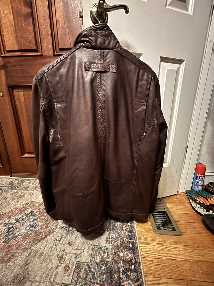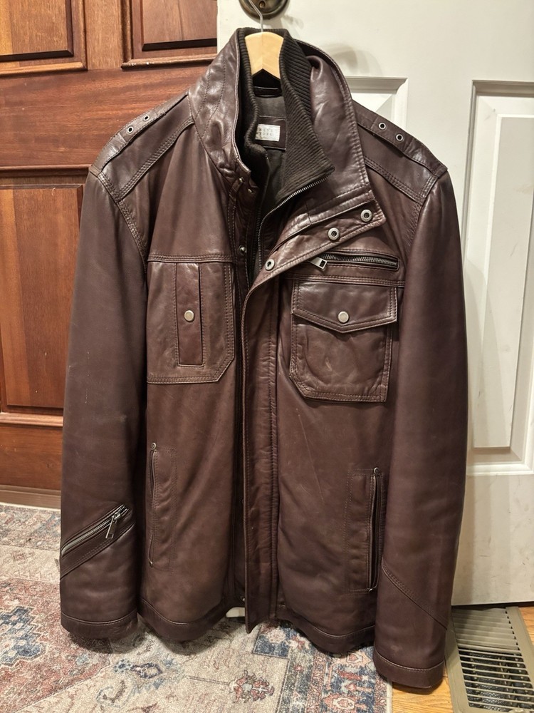 Barneys New York Men's Brown Leather Field Jacket M Zipper Button Snap. Lightly used. Stylish discontinued. Well-made heavy and super warm when it’s below freezing!